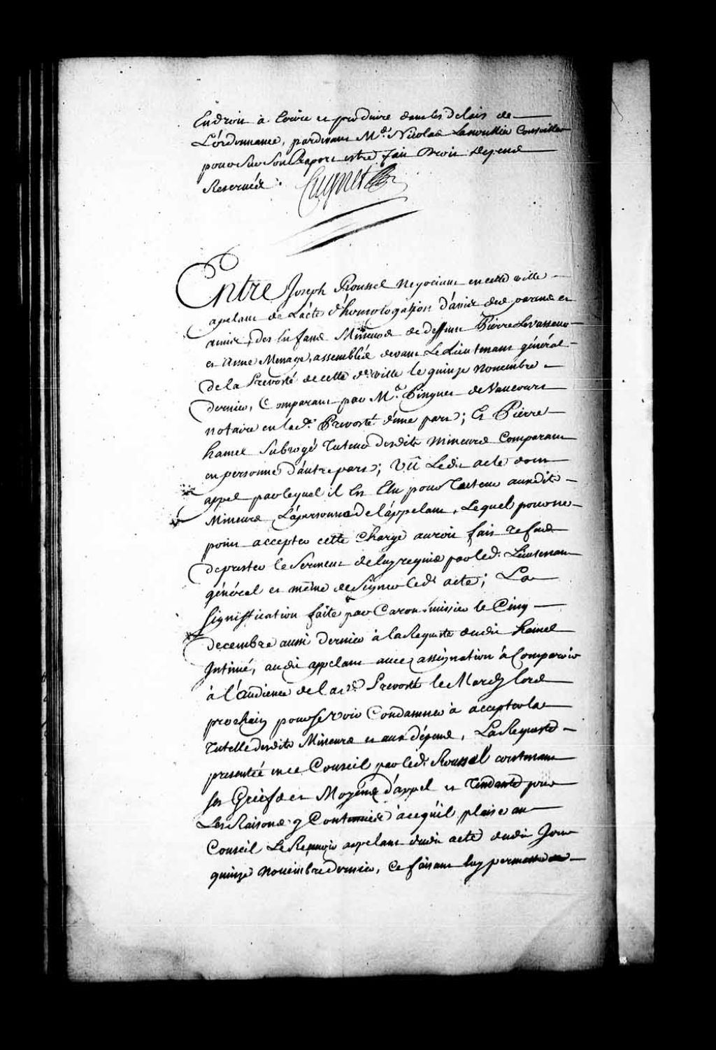Appel mis à néant dans la cause entre Joseph Roussel, négociant de Québec, appelant d'un acte d'homologation d'avis de parents et amis des mineurs de Pierre Levasseur et Anne Ménage, contre Pierre Hamel, subrogé tuteur des dits mineurs. Il est ordonné qu'il sera procédé à de nouvelle élection de tuteur. Faisant droit sur les conclusions du Procureur général du Roi, le Conseil enjoint le lieutenant général de la Prévôté de Québec d'appeler le substitut du dit Procureur général du Roi aux élections de tutelle et autres actes auxquels sa présence sera nécessaire et en cas d'absence ou légitime empêchement du substitut d'appeler le plus ancien praticien pour en faire les fonctions, 19 janvier 1739, Archives nationales à Québec, Fonds Conseil souverain, (03Q,TP1,S28,P18787).