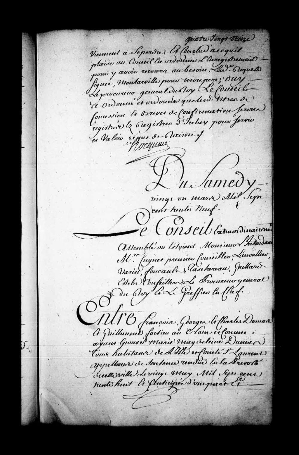 - Appel mis à néant de la sentence rendue en la Prévôté de Québec, le 20 mai 1738, dans la cause entre François, Georges et Charles Dumas et Guillaume Fortier, au nom et comme époux de Marie-Madeleine Dumas, tous habitants de l'île et comté de Saint-Laurent, contre Jeanne Rouleau, veuve en secondes noces de François Dumas