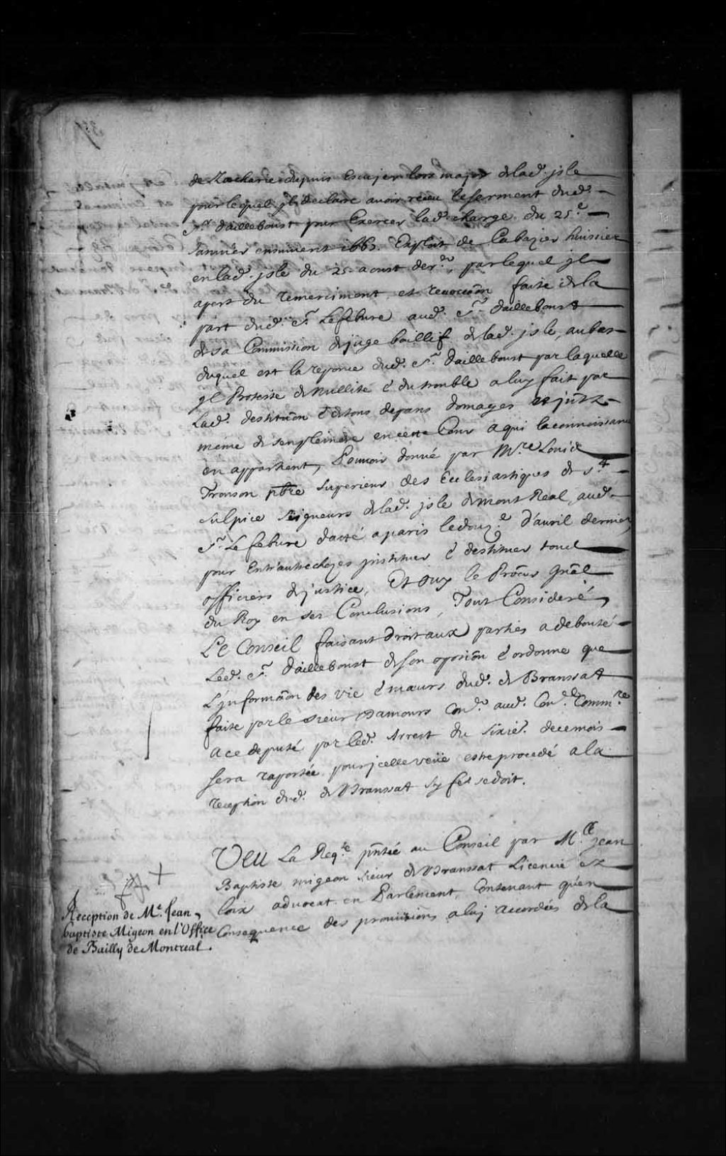 - Transcription du texte avec orthographe modernisée : «Vu la requête présentée au Conseil par Monsieur Jean-Baptiste Migeon sieur de Branssat licencié en lois avocat en parlement, contenant qu'en conséquence des provisions à lui accordées de la charge de bailli juge civil et criminel en l'île de Montréal par messire François Lefebvre supérieur des ecclésiastiques d'icelle, et l'un des prêtres du séminaire de Saint-Sulpice de Paris seigneurs propriétaires de ladite île, pour rendre et administrer la justice suivant les ordonnances royaux aux us et coutumes de la prévôté et vicomté de Paris, qu'il plaise au Conseil de le vouloir installer en ladite charge de bailli conformément aux dites provisions, et ce faisant recevoir de lui le serment de bien et fidèlement exercer ladite charge pour par lui en jouir aux honneurs, prérogatives, privilèges et émoluments y annexés, arrêt du trente et unième août dernier étant au bas de ladite requête [...]