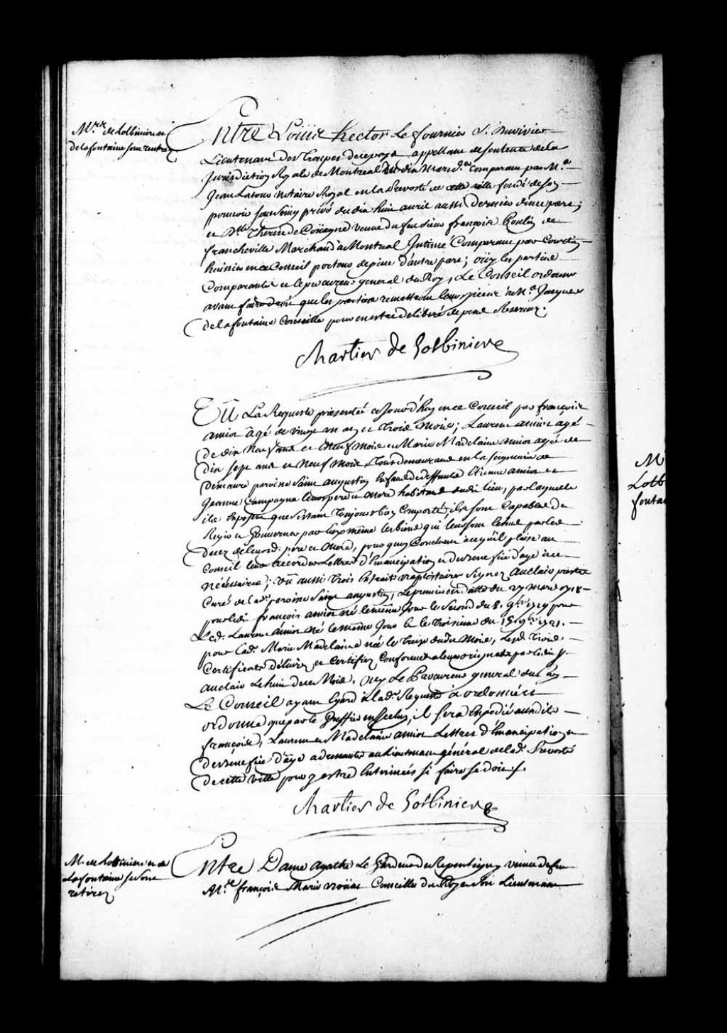 Arrêt qui ordonne, avant de faire droit, que les parties remettront leurs pièces à Jacques de Lafontaine, conseiller, dans la cause entre Louis-Hector Le Fournier Duvivier, lieutenant dans les troupes et appelant de la sentence rendue en la Juridiction de Montréal, le 10 mars 1739, contre Thérèse de Couagne, veuve de François Poulin de Francheville, marchand à Montréal, 13 juillet 1739, Archives nationales à Québec, Fonds Conseil souverain, (03Q,TP1,S28,P18844).