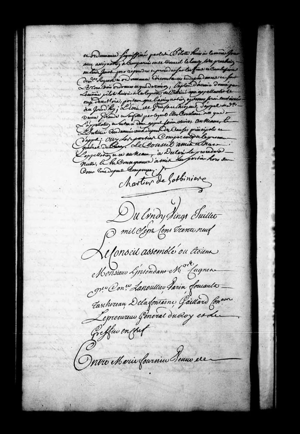 Appel mis à néant de la sentence rendue en la Prévôté de Québec, le 7 juillet 1739, dans la cause entre Marie Fournier, veuve de Joseph Lepage, habitant de l'île et comté de Saint-Laurent, paroisse Saint-François, au nom et comme tutrice des mineurs issus de son mariage avec le dit Lepage, contre Louis Pepin dit la Chaussée, tuteur des enfants issus du premier mariage du dit Lepage avec Claire Racine. L'appellation est mise à néant en ce que la visite en question a été ordonnée avec les appelants. Le Conseil a ordonné que la visite sera faite aux dépens de l'intimé et en présence du substitut du Procureur général du Roi, 20 juillet 1739, Archives nationales à Québec, Fonds Conseil souverain, (03Q,TP1,S28,P18848).
