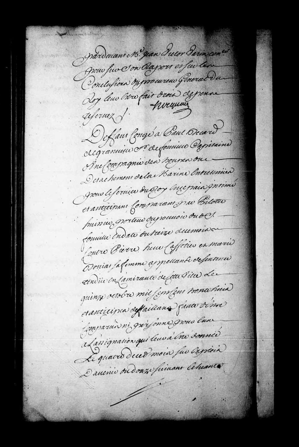 Arrêt qui accorde défaut-congé à Paul Bécard de Grandville, sieur de Fonville, capitaine dans les troupes de la Marine, contre Pierre Hevé, cafetier, et Marie Boulet, sa femme, appelants de la sentence rendue en l'Amirauté de Québec, le 15 octobre 1738, 14 septembre 1739, Archives nationales à Québec, Fonds Conseil souverain, (03Q,TP1,S28,P18872).