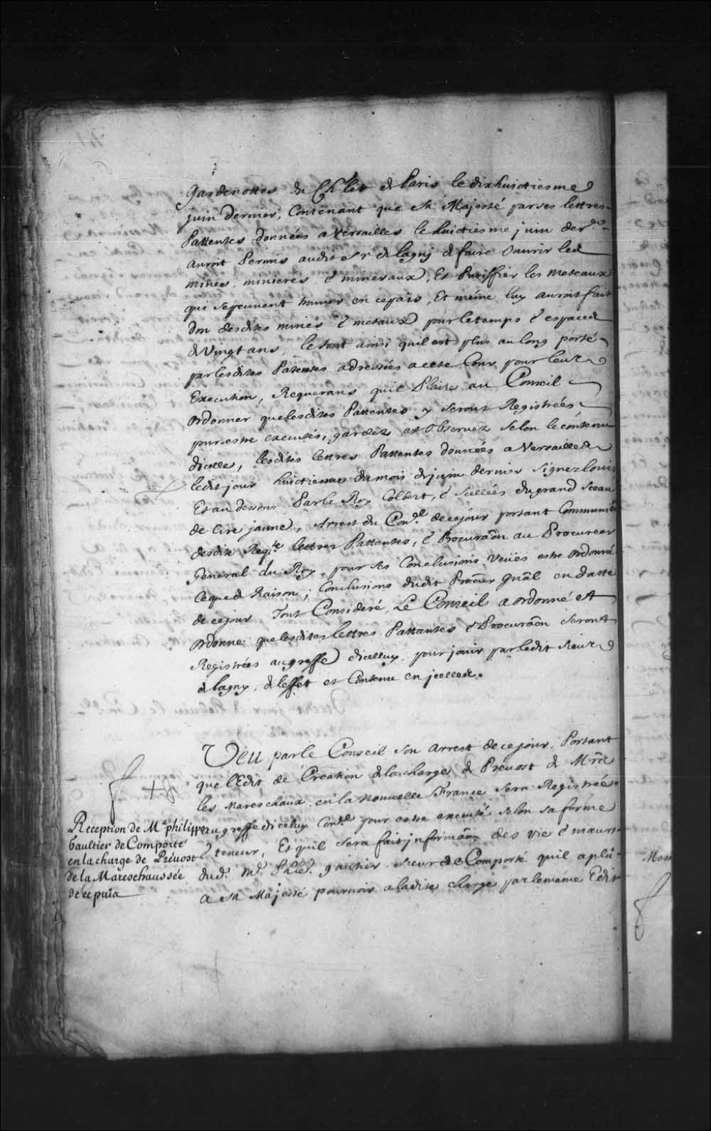 Réception par le Conseil de Philippe Gauthier (Gaultier), sieur de Comporté, en la charge de prévôt des maréchaux de France en Nouvelle-France, avec les gages, droits, honneurs et prérogatives de ladite charge