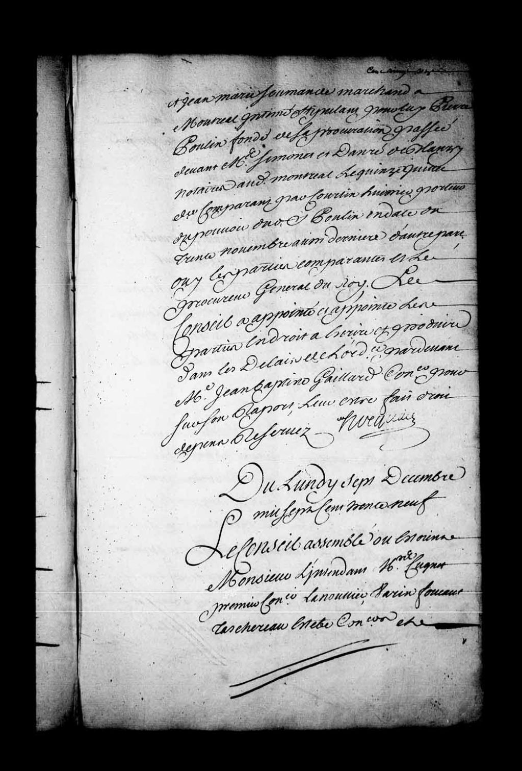 «Le Conseil après avoir vaqué à l'examen de deux procès criminels jusqu'à midi sonné s'est levé», 7 décembre 1739, Archives nationales à Québec, Fonds Conseil souverain, (03Q,TP1,S28,P18901).