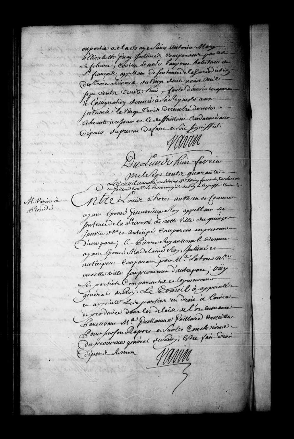 Arrêt qui appointe les parties en droit à écrire et produire, dans les délais de l'ordonnance, devant Guillaume Gaillard, conseiller, dans la cause entre Louis Choret, au nom et comme époux de Geneviève Roy, appelant de la sentence rendue en la Prévôté de Québec, le 15 janvier 1740, contre Pierre Roy, au nom et comme époux de Madeleine Roy, 8 février 1740, Archives nationales à Québec, Fonds Conseil souverain, (03Q,TP1,S28,P18924).