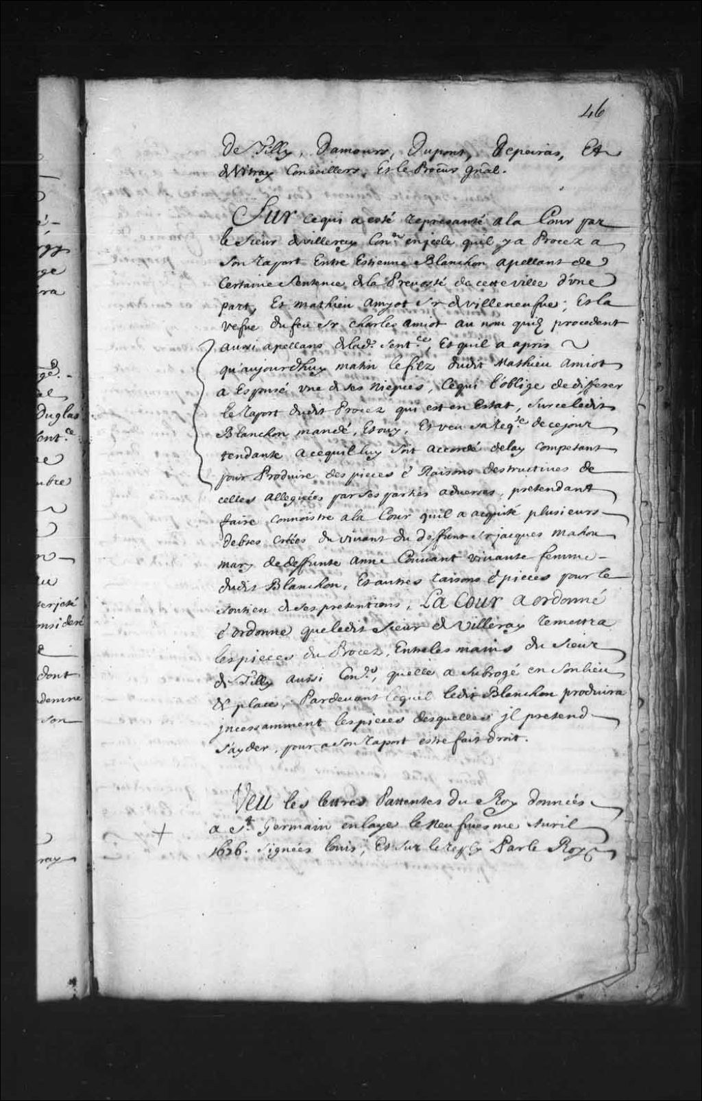 Transcription du texte avec orthographe modernisée : «Vu les lettres patentes du Roi données à Saint-Germain en Laie le neuvième avril 1676 signées Louis, et sur le repli par le Roi Colbert et scellées du grand sceau en cire jaune par lesquelles sa Majesté permet à maître Jean-Baptiste Peuvret conseiller et secrétaire de sa Majesté et greffier en chef de cette Cour d'établir sur le fleuve Saint-Laurent en la Nouvelle-France ou ailleurs dans ledit pays deux moulins propres à scier des planches, faisant sa Majesté défenses à toutes personnes de quelque qualité et condition qu'elles soient de le troubler ni empêcher ni d'établir aucun moulin sur ledit fleuve ou ailleurs dans ledit pays, ni autres machines propres à scier des planches pendant dix années sans la permission et consentement dudit exposant sous les peines y contenues, à la charge par lui d'établir l'un desdits moulins et de le rendre battant et travaillant dans le mois d'août [...]