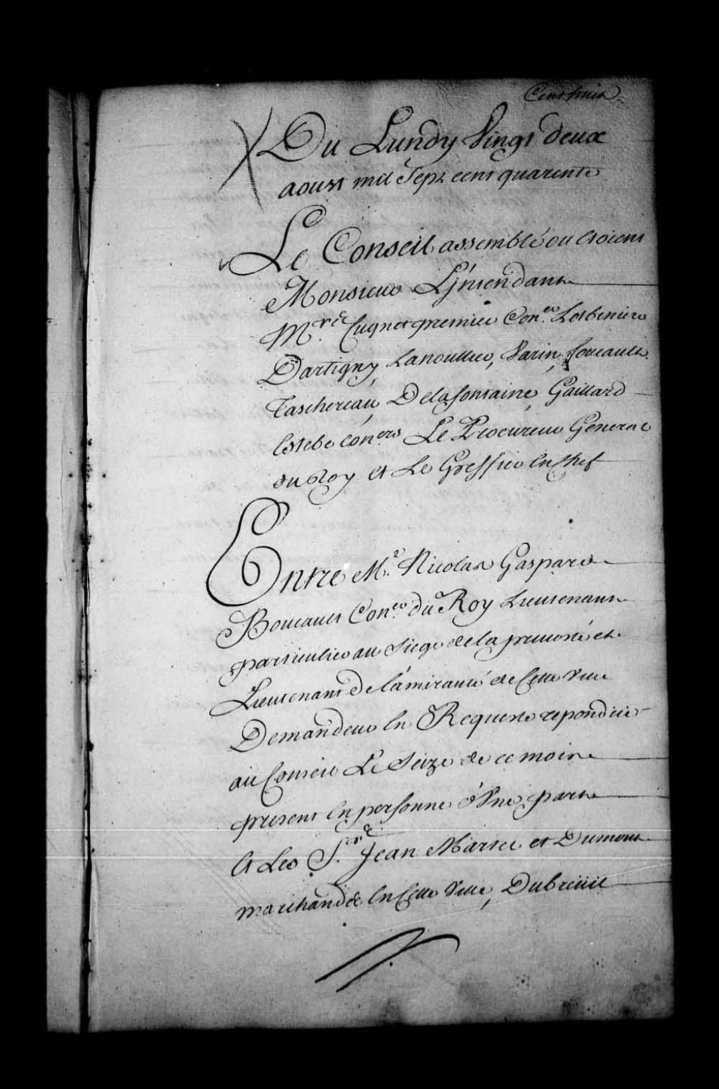 Arrêt qui donne acte à Nicolas-Gaspard Boucault, conseiller du Roi, lieutenant particulier de la Prévôté de Québec, etc., de sa plainte à l'égard de Jean Latour, notaire royal, et des déclarations faites par Jean Martel et Dumont, marchands de Québec, et Dubreuil, huissier. Acte aussi au dit Latour de sa déclaration faite qu'il n'a donné ni entendu donner aucune atteinte à l'honneur et à la réputation du dit Boucault. En conséquence, il est ordonné que les termes injurieux, etc., seront rayés de son mémoire instructif. De plus, défense au dit Latour de récidiver sous les peines de droit