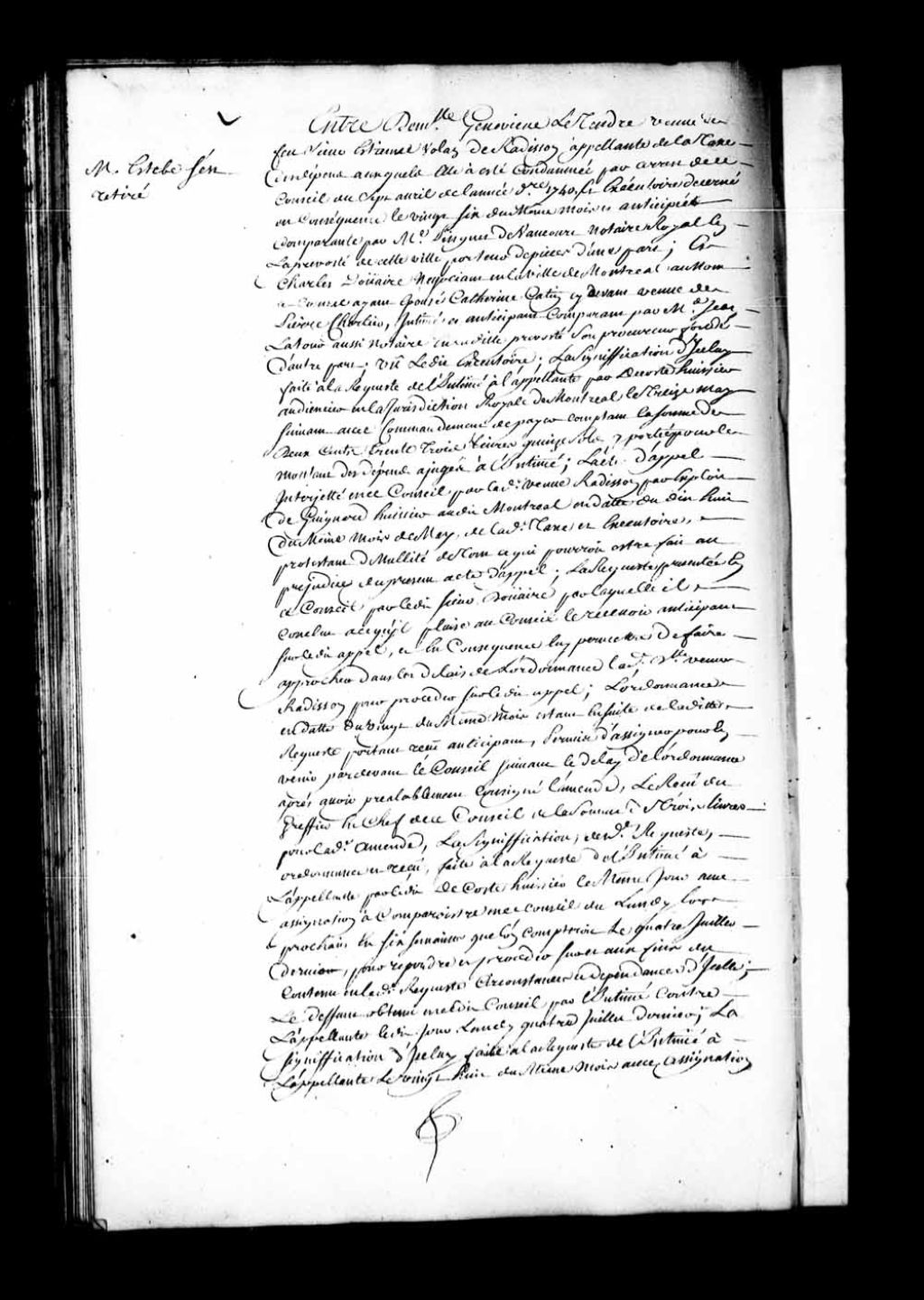Appel mis à néant de la taxe des dépens auxquels elle a été condamnée par arrêt du Conseil Supérieur, du 7 avril 1740, dans la cause entre Geneviève Letendre, veuve de Étienne Volant de Radisson, comparante par maître Pinguet de Vaucour, notaire, contre Charles Douaire, négociant de Montréal, au nom et comme époux de Catherine Catin, veuve de Pierre Chartier. Le Conseil réduit et modère l'exécutoire en appel à la somme de 215 livres 10 sols, les dépens compensés, 6 février 1741, Archives nationales à Québec, Fonds Conseil souverain, (03Q,TP1,S28,P19065).