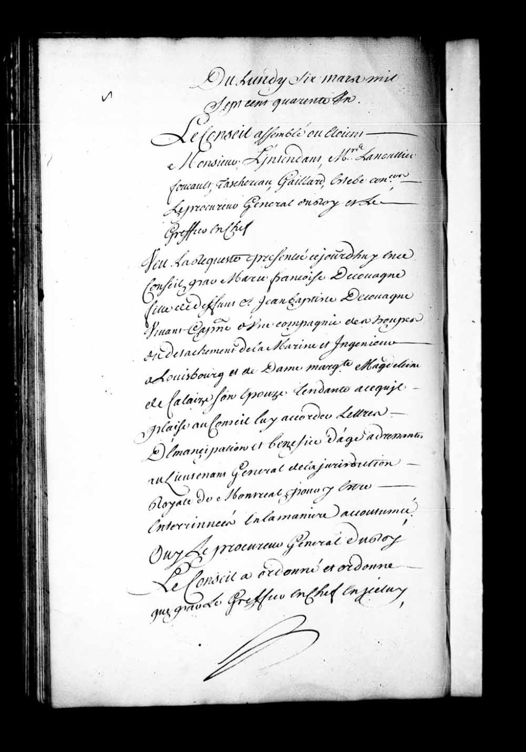 Arrêt qui ordonne, que par le greffier en chef du Conseil, qu'il sera expédié à Marie-Françoise de Couagne, fille de feu Jean-Baptiste de Couagne, capitaine d'une compagnie des troupes de la Marine et ingénieur de Louisbourg, et de Marguerite-Madeleine de Falaise, des lettres d'émancipation et bénéfice d'âge adressées au lieutenant général de la Juridiction de Montréal, 6 mars 1741, Archives nationales à Québec, Fonds Conseil souverain, (03Q,TP1,S28,P19075).
