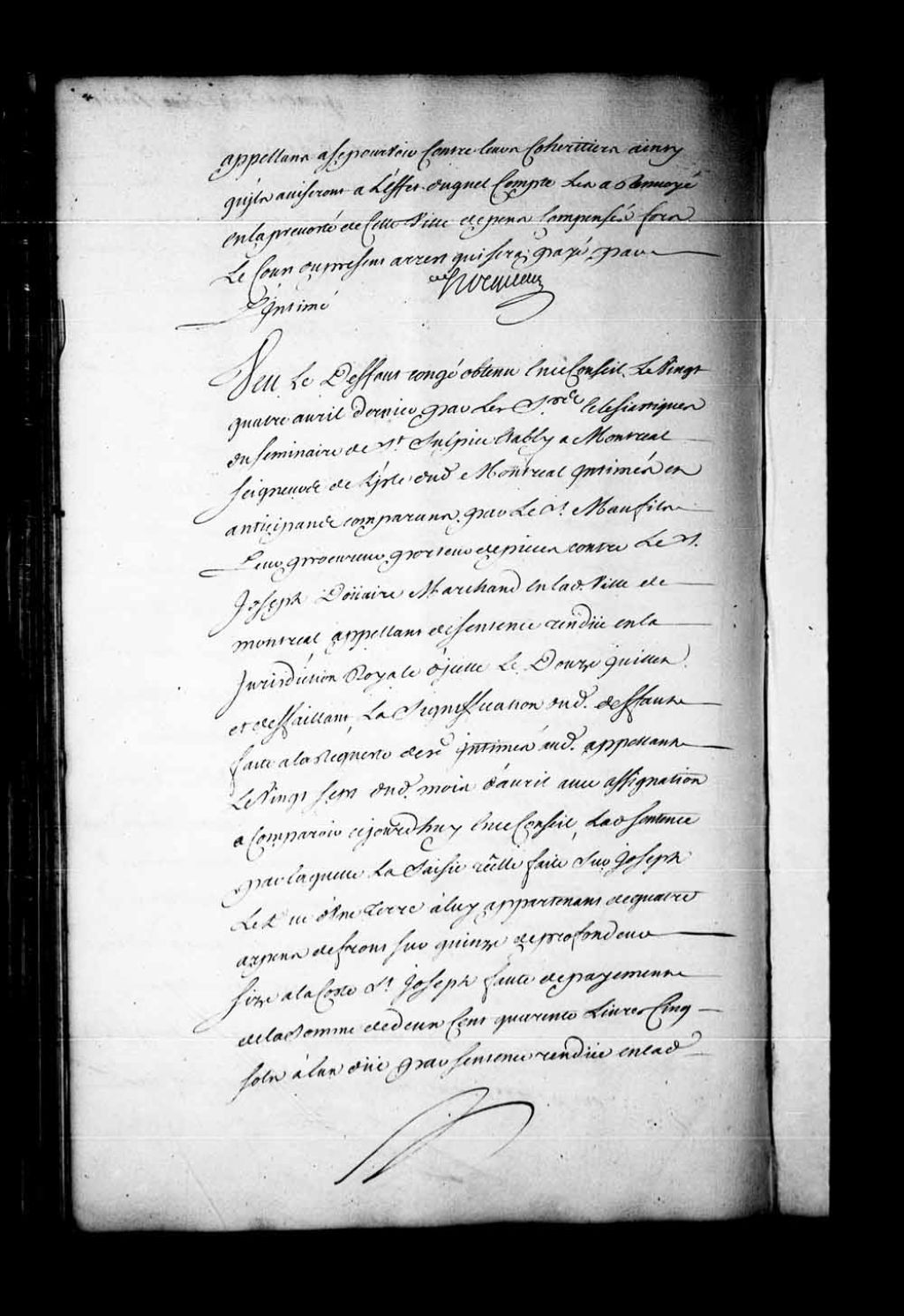 Arrêt qui déclare bien obtenu le défaut-congé obtenu en ce Conseil, le 24 avril 1741, par les sieurs Ecclésiastiques du Séminaire de Saint-Sulpice de Montréal contre Joseph Douaire, marchand de Montréal et appelant de la sentence rendue en la Juridiction de Montréal, le 12 juillet 1740. Le Conseil, adjugeant le profit du dit défaut, déclare l'appelant déchu de son appel et, en conséquence, ordonne que la sentence sortira effet. L'appelant est condamné à l'amende de 12 livres et aux dépens du présent arrêt, 8 mai 1741, Archives nationales à Québec, Fonds Conseil souverain, (03Q,TP1,S28,P19101).