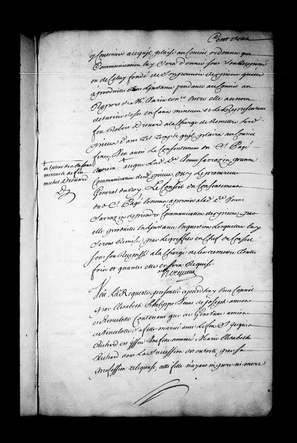 Arrêt qui ordonne, que par le greffier en chef du Conseil, qu'il sera expédié à Elisabeth Philippe, veuve de Joseph Amiot de Vincelotte, aïeule maternelle de Marie-Elisabeth Richard, fille de feu Jacques Richard et de Geneviève Amiot de Vincelote, des lettres d'héritière sous bénéfice d'inventaire de la dite Elisabeth Richard qui a fait profession religieuse et dont elle est la seule héritière, du moins, pour ses meubles et acquêts, 29 mai 1741, Archives nationales à Québec, Fonds Conseil souverain, (03Q,TP1,S28,P19104).