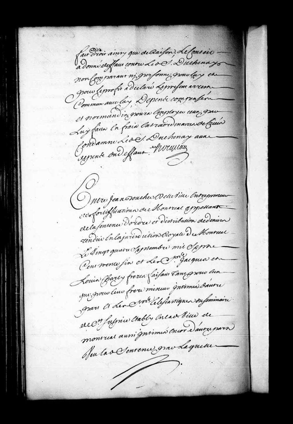 Appel mis à néant de la sentence rendue en la Juridiction de Montréal, le 24 septembre 1736, dans l'instance entre Jean Boucher Belleville, entrepreneur des fortifications de Montréal, contre les frères Jacques et Louis Charly, faisant tant pour eux que pour leur frère mineur, intimés, d'une part, et les sieurs Ecclésiastiques du Séminaire de Saint-Sulpice de Montréal. Appel mis à néant en ce que les Ecclésiastiques du Séminaire de Saint-Sulpice ont été colloqués dans la dite sentence d'ordre pour la somme de 140 livres 12 sols 11 deniers, et qu'il est dit que le surplus de 5150 livres 12 sols 1 denier sera partagé également entre le dit Belleville et Charly. Le Conseil déclare les dits Ecclésiastiques non recevables en leur opposition afin de conserver comme faite après le temps porté par la coutume, etc., etc, 5 juin 1741, Archives nationales à Québec, Fonds Conseil souverain, (03Q,TP1,S28,P19108).