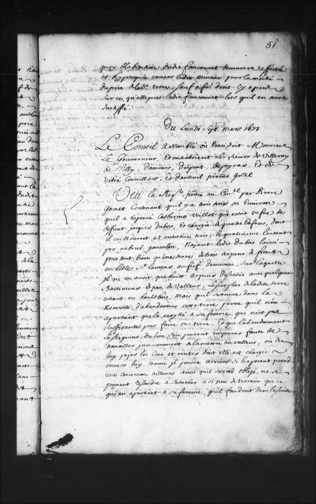 - Transcription du texte avec orthographe modernisée : «Du lundi sept mars 1678. Le Conseil assemblé où présidait Monsieur le gouverneur et où étaient les sieurs de Villeray, de Tilly, Damours, Dupont, Depeiras et de Vitré conseillers et d'Auteuil procureur général. Vu la requête présentée au Conseil par Pierre Ganet contenant qu'il y a trois ans ou environ qu'il a épousé Catherine Vieillot qui était veuve de défunt Jacques Dubois, et chargée de quatre enfant, dont il en nourrit et entretient trois, le quatrième l'étant par Gabriel Gausselin, n'ayant ledit Dubois laissé pour tout bien qu'une terre de trois arpents de front en l'île Saint-Laurent au fief de Mesnu, sur laquelle il n'y avait que huit arpents désertés avec quelques bâtiments de peu de valeur, le surplus de ladite terre étant en haut bois, mais qu'il se trouve dans la nécessité d'abandonner cette terre parce qu'il n'en appartient que la moitié à sa femme, qui n'est pas [...]
