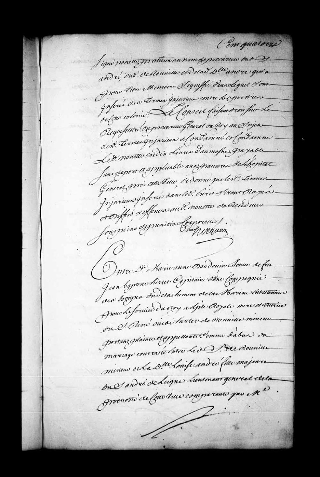 Arrêt qui, dans l'instance entre Marie-Anne Baudoin, veuve de Jean-Baptiste Hertel, capitaine dans les troupes de la Marine à l'île Royale, mère et tutrice de René-Ovide Hertel de Rouville, mineur, appelante comme d'abus du mariage contracté entre le dit de Rouville, mineur, et Louise André, fille majeure du sieur André de Leigne, d'une part, et le sieur de Rouville mineur, la dite demoiselle André, et le sieur André de Leigne, présents en personne, assistés du sieur Nouette, leur procureur, d'autre part. Faisant droit sur le réquisitoire du Procureur général du Roi, défend au dit Nouette, sous les peines de droit, de faire aucunes demandes qu'elles ne soient signées des parties ou qu'il n'en ait d'elles un pouvoir spécial par écrit, 7 juin 1741, Archives nationales à Québec, Fonds Conseil souverain, (03Q,TP1,S28,P19110).