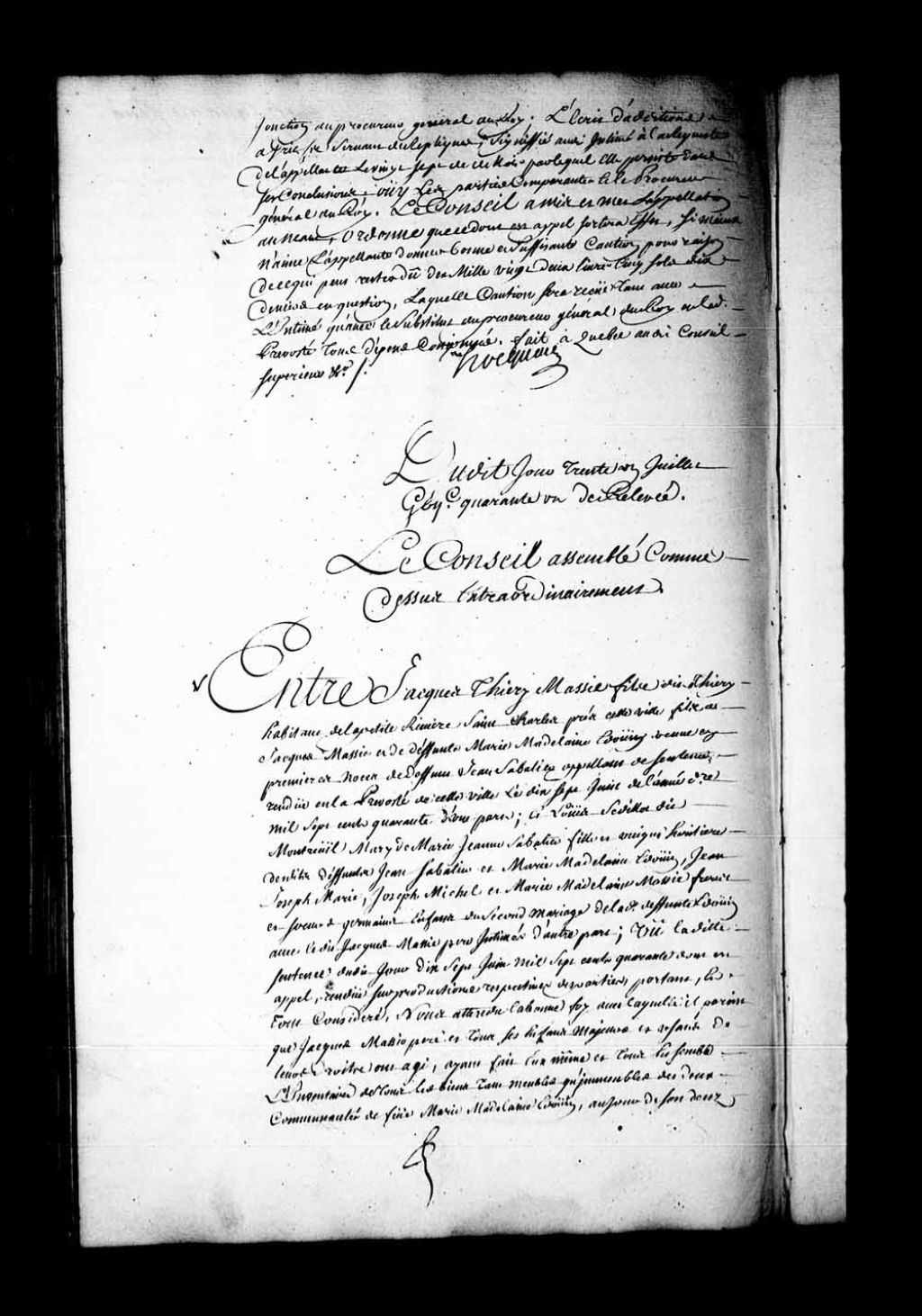 Appel mis à néant de la sentence rendue en la Prévôté de Québec, le 17 juin 1740, dans la cause entre Jacques Thierry Massie fils, habitant de la Petite-Rivière-Saint-Charles, près de Québec, fils de Jacques Massie et de défunte Marie Edouin, veuve en premières noces de Jean Sabatier, contre Louis Sedillot dit Montreuil, mari de Marie-Jeanne Sabatier, fille et unique héritière des dits défunts Jean Sabatier et Marie-Madeleine Edouin, Jean-Joseph Marie, Joseph-Michel et Marie-Madeleine Massie, frères et soeurs germains, enfants du second mariage de la dite défunte Edouin avec le dit Jacques Massie, père, intimés. Il est ordonné que la sentence en appel sortira son plein et entier effet. Condamne l'appelant à l'amende de 3 livres pour son « fol appel » et aux dépens