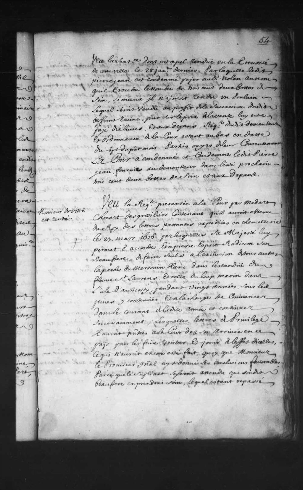 Transcription du texte avec orthographe modernisée : «Vu la requête présentée à la Cour par Médard Chouart Desgroiseliers contenant qu'ils aurait obtenu du Roi des lettres patentes expédiées en chancellerie le 28e mars 1676 par lesquelles sa Majesté lui permet et accorde et à Pierre Esprit Radisson son beau-frère de faire seuls et à l'exclusion de tous autres la pêche du marsouin blanc dans l'étendue du fleuve Saint-Laurent, et celle de loup marin dans l'île d'Anticosti pendant vingt années, sous les peines y contenues et à la charge de commencer dans le courant de ladite année et continuer incessamment, lesquelles lettres de privilège il aurait présentées à la Cour dès son arrivée en ce pays pour les faire registrer et jouir de l'effet d'icelles, ce qui n'avait encore été fait, quoique Monsieur le procureur général ait donné ses conclusions favorables, parce que le suppliant se serait attendu que sondit beau-frère en prendrait soin, [...]