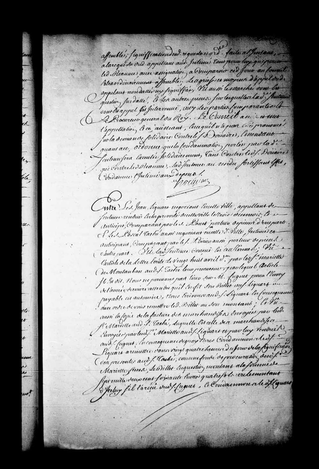 Appel mis à néant de la sentence rendue en la Prévôté de Québec, le 3 octobre 1741, dans la cause entre Jean Liquart, négociant de Québec, contre Pascal Taché, négociant de Québec. Ce qui est en appel sortira effet, cependant le dit Liquart demeurera bien et valablement déchargé envers les sieurs Mariette, 9 octobre 1741, Archives nationales à Québec, Fonds Conseil souverain, (03Q,TP1,S28,P19175).
