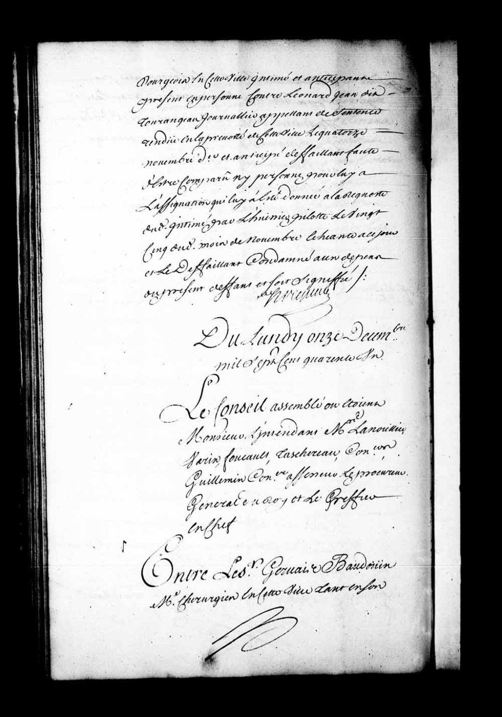 Arrêt dans la cause entre le sieur Gervais Baudouin, maître-chirurgien de Québec, tant en son nom que comme fondé du pouvoir de Marie-Anne Baudouin, veuve du sieur Hertel de Rouville, capitaine dans les troupes de la Marine, contre Henri DuSautoy, négociant à Québec, au nom et comme époux de Marie-Anne Roussel, veuve de Louis Baudouin. L'intimé, au dit nom, est débouté de la répétition de celle-ci, sauf aux héritiers de la dite veuve, femme de l'intimé, à s'en faire faire raison par les appelants après le dit douaire coutumier fini. La dite veuve, femme de l'intimé, devra aussi faire régler et liquider, ainsi qu'il appartiendra, le plus ou le moins de la récompense et mi-denier qu'elle prétend de 495 livres avec les dits appelants. La dite sentence au résidu sortissant effet