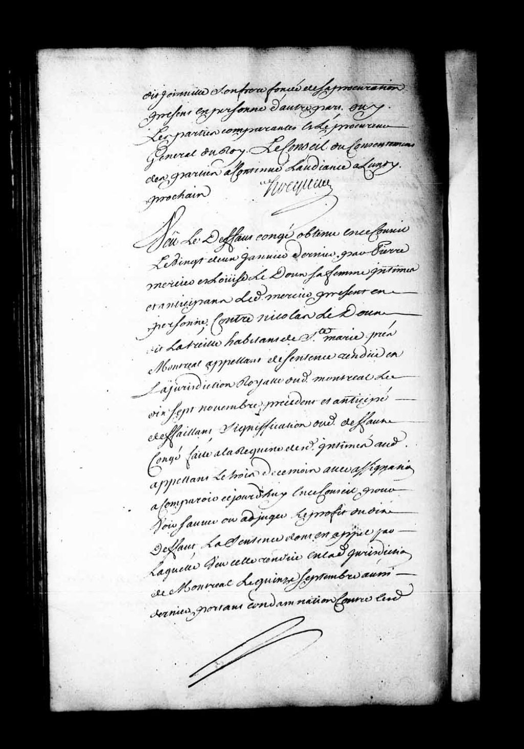 Arrêt qui déclare le défaut-congé bien et dûment obtenu en ce Conseil, le 22 janvier 1742, par Pierre Mercier et Louise Ledoux, sa femme, contre Nicolas Ledoux dit Latreille, habitant de Sainte-Marie, près de Montréal, appelant de la sentence rendue en la Juridiction de Montréal, le 17 novembre 1741. Le Conseil, adjugeant le profit du dit défaut, déclare le dit appelant déchu de son appel et ordonne que la dite sentence sortira effet à la réserve de la contrainte par corps, sauf à la prononcer par la suite si le cas y échoit. Nicolas Ledoux est condamné à l'amende de 12 livres et aux dépens du présent défaut-congé, 12 février 1742, Archives nationales à Québec, Fonds Conseil souverain, (03Q,TP1,S28,P19210).