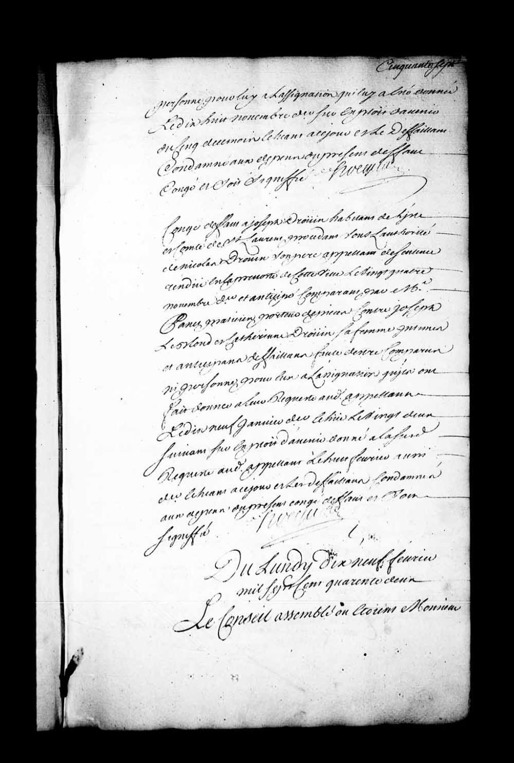 Arrêt qui ordonne que les pièces des parties seront communiquées au Procureur général du Roi pour que dans ses conclusions puisse être ordonné ce qu'il appartiendra dans la cause entre Henri DuSautoy, visiteur du Domaine du Roi au bureau de Québec, et Marie Roussel, son épouse, auparavant veuve de Louis Baudoin, négociant à Québec, appelants de la sentence rendue en la Prévôté de Québec, le 30 janvier 1742, contre Gervais Baudoin, maître-chirurgien à Québec, tant en son nom que comme fondé du pouvoir de Marie-Anne Baudoin, veuve du sieur Hertel de Rouville, 19 février 1742, Archives nationales à Québec, Fonds Conseil souverain, (03Q,TP1,S28,P19213).