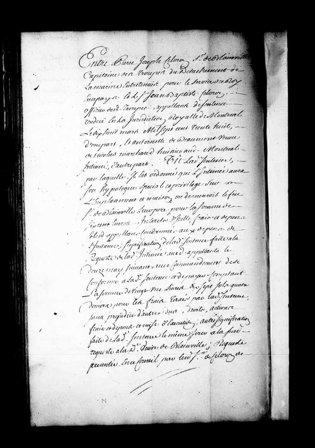 Appel mis à néant de la sentence rendue en la Juridiction de Montréal, le 18 mars 1738, dans la cause entre Pierre-Joseph Céloron de Blainville, capitaine dans les troupes de la Marine, et Jean-Baptiste Céloron, aussi officier dans les dites troupes, contre Antoinette de Beaumont, veuve de Nicolas Marchand, huissier à Montréal. Pierre-Joseph Céloron de Blainville et Jean-Baptiste Céloron sont condamnés à l'amende de leur «fol appel» et aux dépens de la cause d'appel