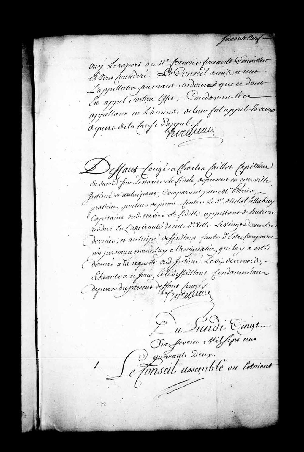 Arrêt qui accorde défaut-congé à Charles Caillot, capitaine en second sur le navire le Fidèle, présentement à Québec, contre Michel Salaberry, capitaine du dit navire le Fidèle et appelant de la sentence rendue en l'Amirauté de Québec, le 20 décembre 1741, 19 février 1742, Archives nationales à Québec, Fonds Conseil souverain, (03Q,TP1,S28,P19218).