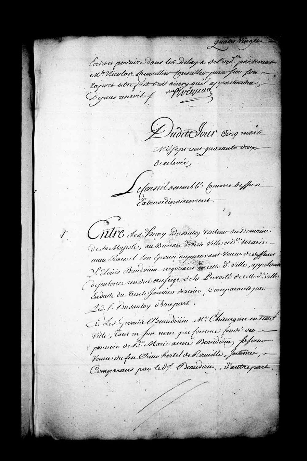 - Arrêt dans la cause entre Henri Dusautoy, visiteur du Domaine de Sa Majesté au bureau de Québec, et Marie-Anne Roussel, sa femme, auparavant veuve de Louis Baudoin, négociant, appelant de la sentence rendue en la Prévôté de Québec, le 30 janvier 1742, contre Gervais Baudoin, maître chirurgien de Québec, tant en son nom que comme fondé du pouvoir de Marie-Anne Baudoin, sa soeur, veuve du sieur Hertel de Rouville. Règlement de la succession de Louis Baudoin