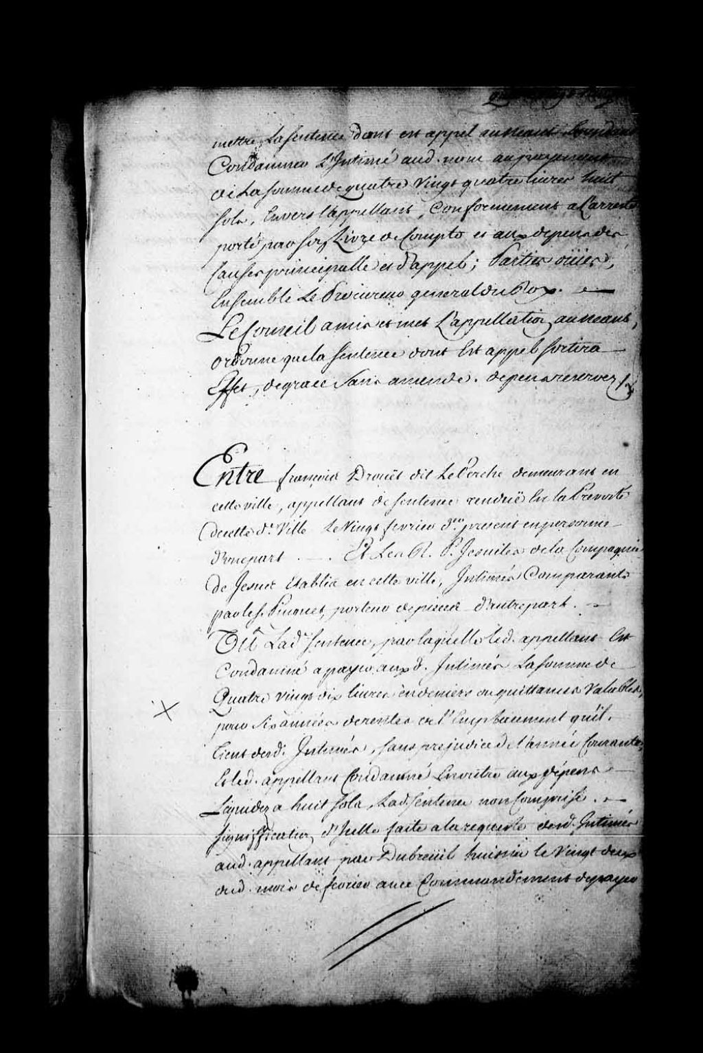 Appel mis à néant de la sentence rendue en la Prévôté de Québec, le 20 février 1742, dans la cause entre François Drouet dit La Perche, demeurant à Québec, contre et les Révérends Pères Jésuites, établis à Québec, comparants par le R. Père Pinguet. Appel d'un jugement condamnant le dit Drouet dit La Perche à payer 90 livres pour 6 années de rentes d'un emplacement situé en la Haute-Ville de Québec, rue Saint-Jean