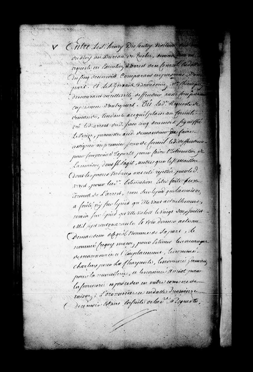 Arrêt qui, dans la cause entre Henri Dusautoy, visiteur du Domaine du Roi au bureau de Québec, demandeur en requête en exécution d'arrêt de ce Conseil, du 5 mars 1742, contre Gervais Baudoin, maître-chirurgien de Québec, donne acte aux parties de la nomination présentement faite en la manière accoutumée par chacune d'elles d'experts, lesquels prêteront serment par-devant Nicolas Lanouillier, conseiller, et ensuite procéderont à l'estimation de la maison en contestation, conformément et en exécution de l'arrêt du 5 de ce mois, dont ils dresseront procès-verbal pour que celui-ci soit rapporté au Conseil et ainsi ordonné ce que de raison, 20 mars 1742, Archives nationales à Québec, Fonds Conseil souverain, (03Q,TP1,S28,P19236).