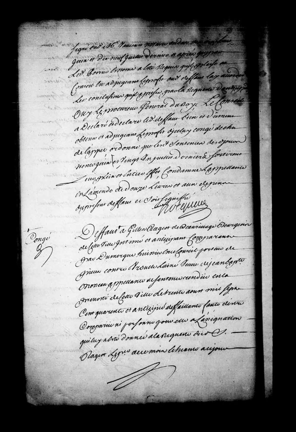 Arrêt qui accorde défaut-congé à Gilles Rageot de Beaurivage, bourgeois de Québec, contre Ursule Laîné, veuve de Jean-Baptiste Rousseau et appelante de la sentence rendue en la Prévôté de Québec, le 30 août 1740, 6 août 1742, Archives nationales à Québec, Fonds Conseil souverain, (03Q,TP1,S28,P19295).