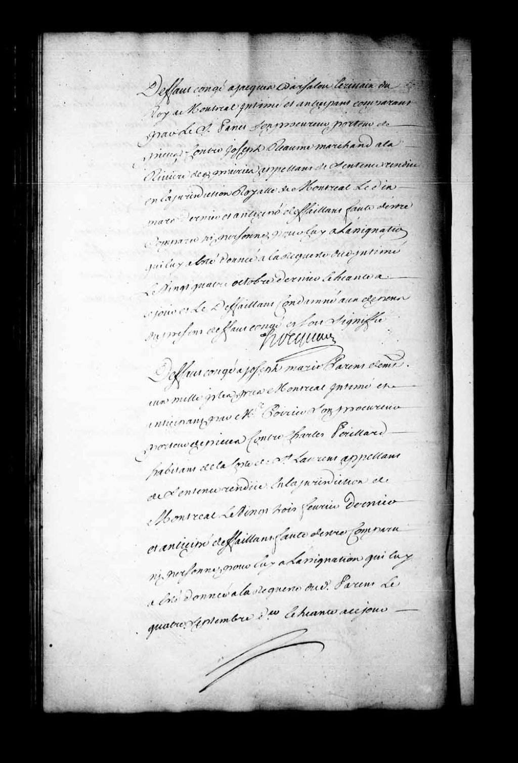 Arrêt qui accorde défaut-congé à Jacques Barsalou, écrivain du roi à Montréal, comparant par le sieur Panet, contre Joseph Rhéaume, marchand à la Rivière-des-Prairies et appelant de la sentence rendue en la Juridiction de Montréal, le 10 mars 1742