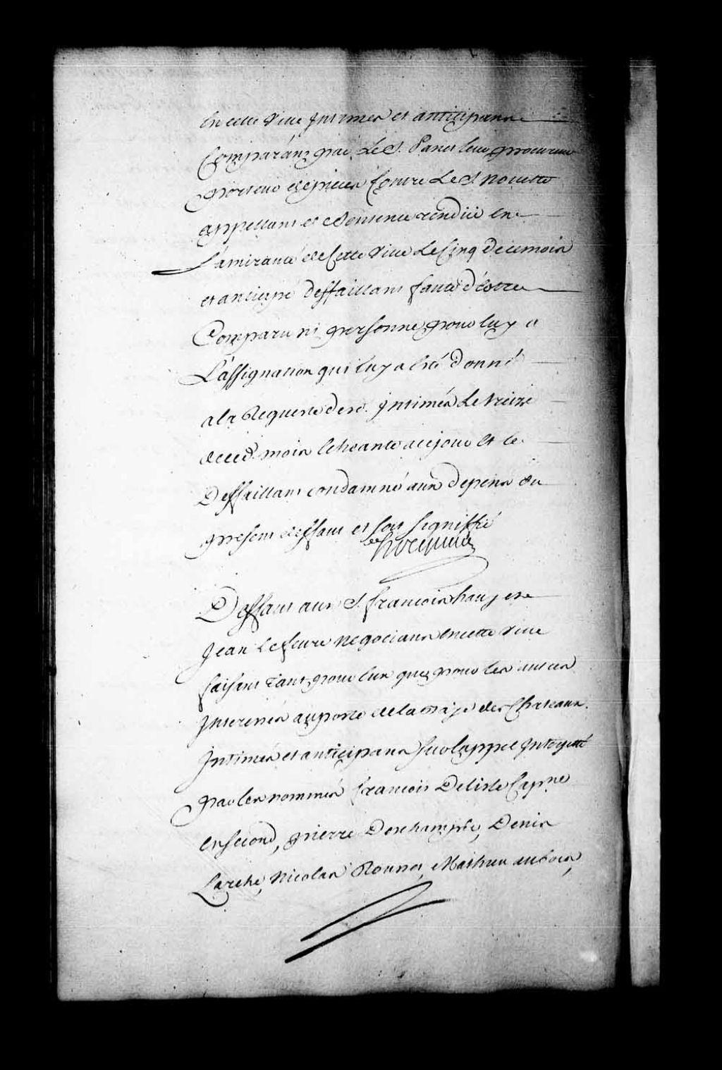 Arrêt qui accorde défaut-congé à François Havy et Jean Lefebvre, négociants à Québec, tant pour eux que pour les autres intéressés au poste de la Baie-des-Châteaux, contre les nommés François Delisle, capitaine en second, Pierre Deschamps, Denis Larche, Nicolas Rousset, Mathieu Aubois, Jacques Delisle, Thierry Delisle, Joseph Lyonnais, Jacques Ménard, Ignace Levasseur, Régis Levasseur, Jean Godet, Étienne Samson et Pierre Fagot, maître et matelots sur le bateau l'Expérience, appelants de la sentence rendue en l'Amirauté de Québec, le 17 novembre 1742 le Conseil ordonne pour le profit du dit défaut que les dits maître et matelots seront réassignés pour en venir au Conseil lundi prochain
