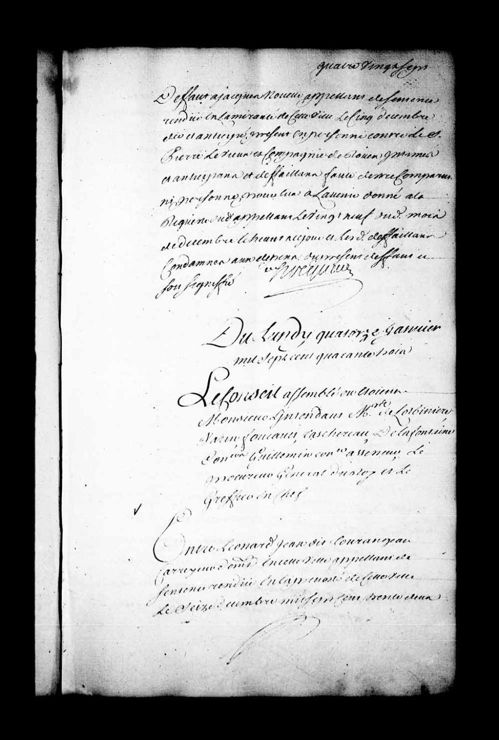 Arrêt qui met hors de cour sur l'exécution de la Prévôté de Québec, du 16 décembre 1742, dans la cause entre Léonard Jean dit Tourangeau, corroyeur (ouvrier qui apprête le cuir, les peaux) demeurant à Québec, contre le nommé Dubeau, charretier à Québec, au nom et comme ayant les droits cédés de Louis Rouer d'Artigny, conseiller au Conseil Supérieur. Appel d'une sentence qui condamne le nommé Jean dit Tourangeau à fournir au sieur Rouer d'Artigny une barrique d'anguilles, 14 janvier 1743, Archives nationales à Québec, Fonds Conseil souverain, (03Q,TP1,S28,P19365).