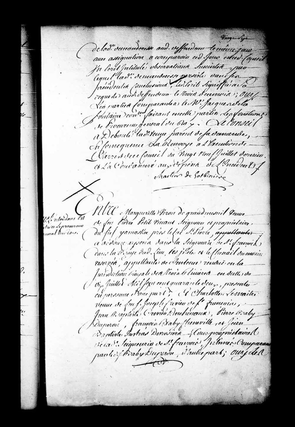 Arrêt qui ordonne, avant de faire droit, que les pièces des parties seront remises à Jacques de Lafontaine de Belcour, conseiller, pour en être délibéré, dans la cause entre Marguerite Veron de Grandmesnil, veuve de Pierre Petit, seigneur et propriétaire du fief d'Yamaska, et de 12 arpents dans la seigneurie de Saint-François, appelante de la sentence rendue en la Juridiction des Trois-Rivières, le 10 juillet 1742, contre Charlotte Lemaître, veuve de Joseph Crevier de Saint-François, Jean-Baptiste Crevier Deschenaux, Pierre Baby Duperron, François Baby Chenneville, et Jean-Baptiste Jutras Desrosiers, tous propriétaires de la dite seigneurie de Saint-François