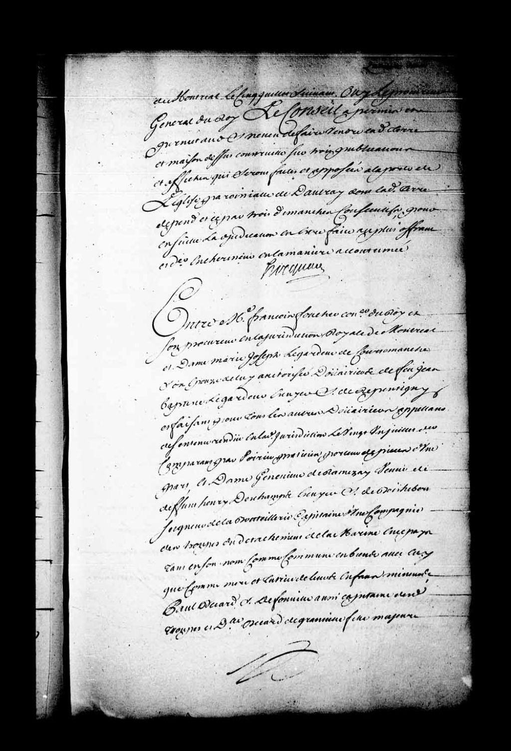 Arrêt qui appointe les parties en droit à écrire et produire, dans les délais de l'ordonnance, pour que dans les conclusions du procureur général du Roi puisse être ordonné ce qu'il appartiendra dans la cause entre François Foucher, procureur du Roi en la Juridiction de Montréal, et Marie-Joseph Legardeur de Courtemanche, son épouse, douairière de feu Jean-Baptiste Legardeur de Repentigny et faisant pour tous les autres douairiers, appelant de la sentence rendue en la dite Juridiction de Montréal, le 21 juillet 1743, contre dame Geneviève de Ramesay, veuve de Henri Deschamps de Boishébert, seigneur de la Bouteillerie, capitaine dans les troupes de la Marine, tant en son nom comme commune en biens avec lui que comme mère et tutrice de leurs enfants mineurs; Paul Bécard de Fonville, aussi capitaine des troupes, et demoiselle Bécard de Fonville, fille majeure, tous héritiers par représentation de Geneviève Macard, leur mère, (légataire universelle avec Charles Macard, leur oncle), veuve en premières noces du sieur Bazire, receveur général du Domaine du Roi, en secondes noces de François Provost, gouverneur des Trois-Rivières, et en dernières noces du marquis Charles d'Aloigny de laGrois, commandant des troupes, etc., tous créanciers de la succession de feu Jean-Baptiste Legardeur de Repentigny et de feue Marguerite Nicolet, son épouse, 2 septembre 1743, Archives nationales à Québec, Fonds Conseil souverain, (03Q,TP1,S28,P19485).