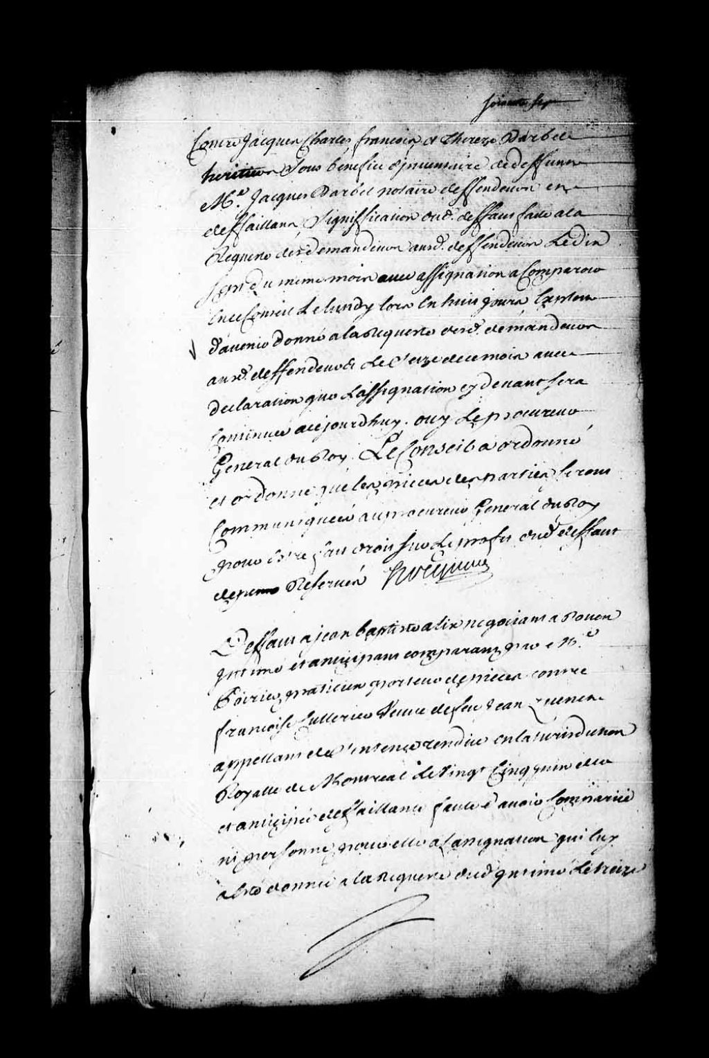 Arrêt qui accorde défaut à Jean-Baptiste Alix, négociant à Rouen, contre Françoise Cullerier, veuve de Jean Quenet et appelant de la sentence rendue en la Juridiction de Montréal, le 25 juin 1743, 18 novembre 1743, Archives nationales à Québec, Fonds Conseil souverain, (03Q,TP1,S28,P19511).