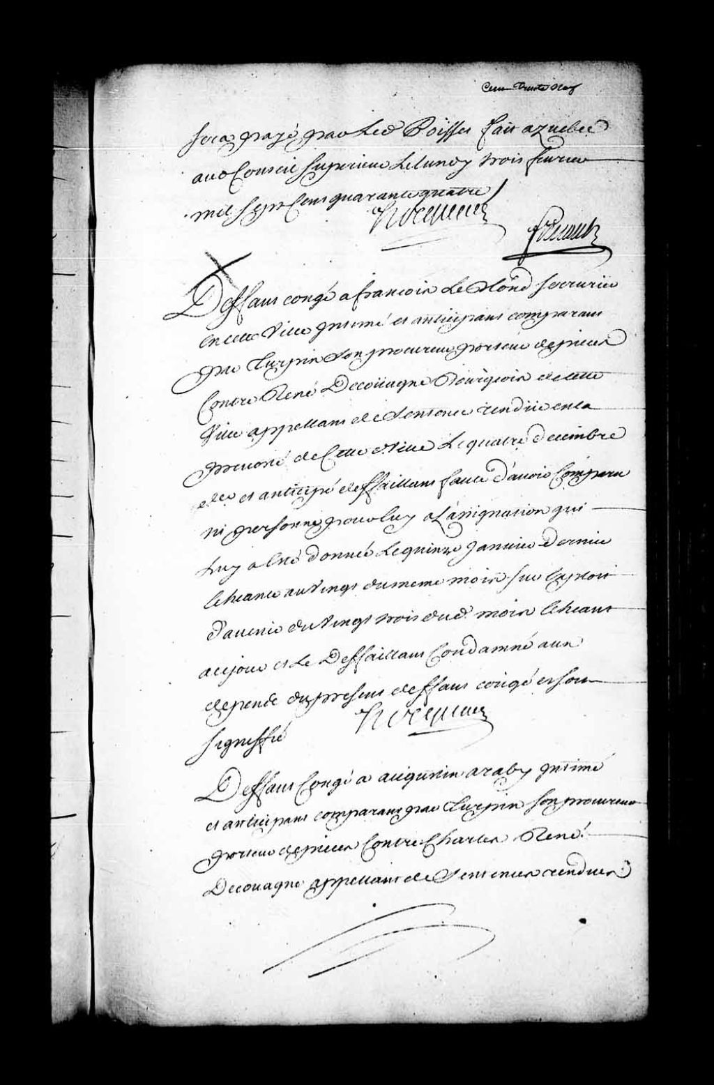Arrêt qui accorde défaut-congé à Augustin Araby contre Charles René de Couagne, appelant des sentences rendues en la Prévôté de Québec, les 12 novembre et 4 décembre 1743, 3 février 1744, Archives nationales à Québec, Fonds Conseil souverain, (03Q,TP1,S28,P19548).