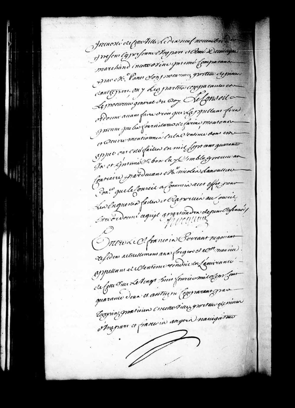 Appel mis à néant de la sentence rendue en l'Amirauté de Québec, le 28 février 1742, dans la cause entre François Perrault, négociant résidant actuellement aux Forges-du-Saint-Maurice, contre François Angers, navigateur demeurant en la seigneurie de Neuville. Appel d'une sentence qui condamne Perrault à payer à Angers 294 livres 13 sols pour fret (prix du transport, par voie maritime, d'un chargement de marchandises) d'effets. Le Conseil a déchargé l'appelant des condamnations prononcées contre lui, sauf à l'intimé à se pourvoir ainsi qu'il avisera contre les intéressés dans les Forges-du-Saint-Maurice, 16 mars 1744, Archives nationales à Québec, Fonds Conseil souverain, (03Q,TP1,S28,P19569).