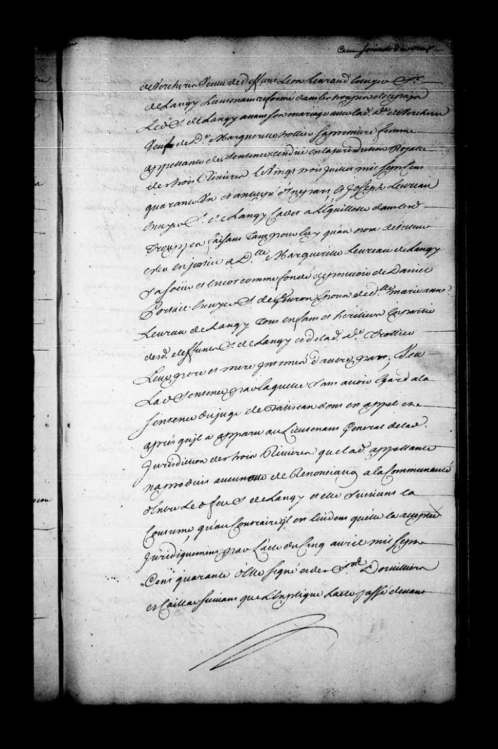 Arrêt dans la cause entre Marguerite Jarret de Verchères, veuve de Léon Levreau de Langy, lieutenant réformé dans les troupes, le dit Langy avant son mariage avec la demoiselle de Verchères veuf de Marguerite Trottier, appelante de la sentence rendue en la Juridiction des Trois-Rivières, le 23 juillet 1741, contre Joseph Levreau de Langy, cadet à l'aiguillette dans les troupes, faisant tant pour lui qu'au nom de tuteur de Marguerite Levreau de Langy, sa soeur, et encore comme fondé de pouvoir de Daniel Portail de Gevron, époux de Marie-Anne Levreau de Langy, tous enfants et héritiers en partie des dits défunts de Langy et Trottier, leurs père et mère. Appel et sentence mis à néant. Le Conseil condamne les intimés, enfants du premier lit du sieur Léon Levreau de Langy, à payer à l'appelante les deux tiers de la somme de 600 livres due à elle. Condamne également les mêmes intimés à payer à l'appelante les deux tiers de la rente de 18 livres 15 sols du douaire préfix de 1 000 livres. De plus, les intimés sont renvoyés de la demande de l'appelante tant d'une chambre garnie et de son préciput que de sa part d'enfant. Marguerite Jarret de Verchères est mise hors de cour pour le deuil demandé