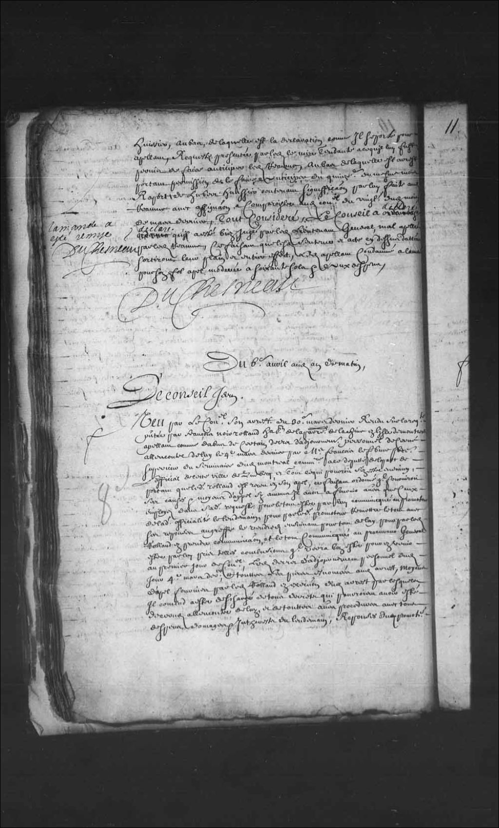 Transcription du texte avec orthographe modernisée : «Du 6e avril audit an de matin. Le Conseil Idem. Vu par le Conseil son arrêt du 30e mars dernier rendu sur la requête présentée par François Noir Rolland habitant de la paroisse de Lachine en l'île de Montréal appelant comme d'abus de certain décret d'ajournement personnel décerné à l'encontre de lui le 4e mars dernier par messire François Lefebvre prêtre supérieur du séminaire dudit Montréal commissaire à ce député de la part de l'official de cette ville de Québec, et tout ce qui pourrait s'en être ensuivi, portant que ledit Rolland est reçu en son appel, ce faisant ordonné qu'il fournirait ses causes et moyens d'appel si aucuns il avait à fournir autres que ceux employés dans sa dite requête pour le tout être par lui communiqué au promoteur de ladite officialité le lendemain pour par ledit promoteur remettre le tout avec ses réponses au greffe le vendredi ensuivant pour tout délai [...]