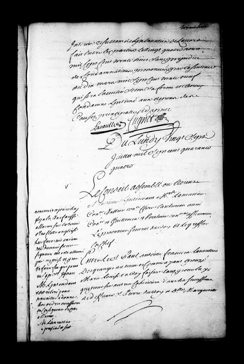 Arrêt qui renvoie Monsieur Pierre Hazeur, prêtre chanoine et pénitencier de la cathédrale de Québec, au nom et comme exécuteur testamentaire de Catherine deLino au jour de son décès épouse de Jean-François Hazeur, de la demande formulée contre lui par Paul-Antoine-François Lanoullier des Granges, au nom et comme époux de Marie-Louise DuRoy, faisant tant pour lui que pour ses autres co-héritiers dans les successions de défunt Pierre DuRoy et damoiselle Marguerite Levasseur, 27 juillet 1744, Archives nationales à Québec, Fonds Conseil souverain, (03Q,TP1,S28,P19626).