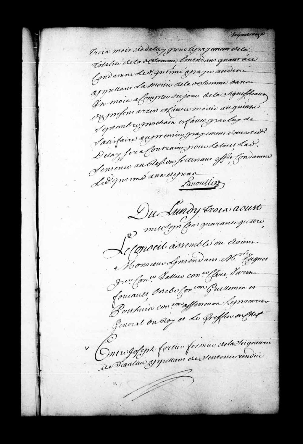 Appel mis à néant de la sentence rendue en la Prévôté de Québec, le 14 juillet 1744, dans la cause entre Joseph Fortier, fermier de la seigneurie de Beaulieu, contre Jacques Gourdeau, seigneur en partie de la dite seigneurie de Beaulieu et de la Grossardière. Appel mis à néant en ce que Joseph Fortier est condamné à donner caution. Faute par lui de la donner, que le dit bail sera résilié. Jacques Gourdeau est débouté de sa demande de caution. Il est ordonné que le dit bail sera exécuté selon sa forme et teneur, 3 août 1744, Archives nationales à Québec, Fonds Conseil souverain, (03Q,TP1,S28,P19629).