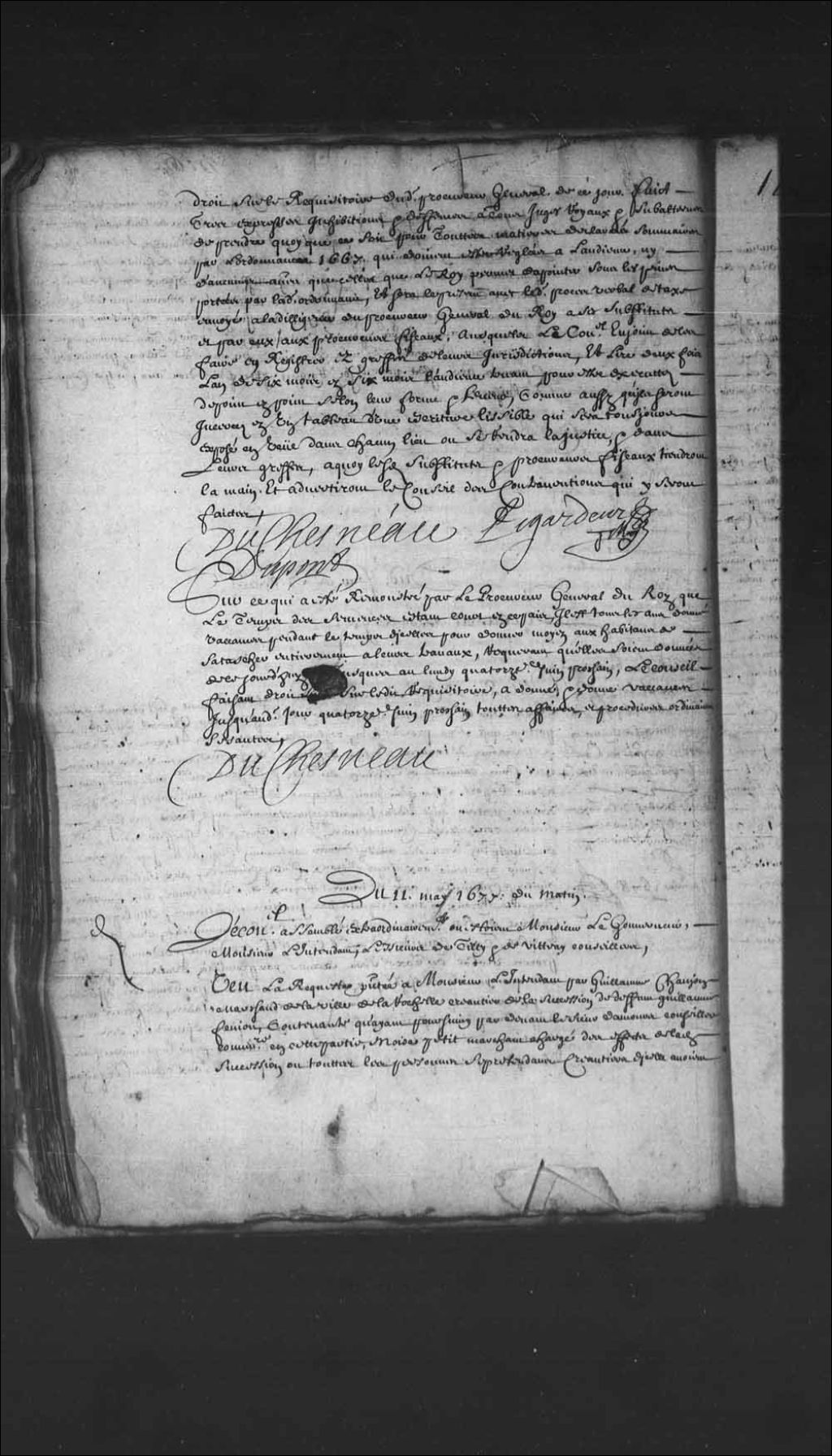 Transcription du texte avec orthographe modernisée : «Sur ce qui a été remontré par le procureur général du Roi que le temps des semences étant court en ce pays, il est tous les ans donné vacances pendant le temps d'icelles pour donner moyen aux habitants de s'attacher entièrement à leurs travaux, requérant qu'elles soient données de ce jourd'hui jusqu'au lundi quatorzième juin prochain, le Conseil faisant droit sur ledit réquisitoire, a donné et donne vacances jusqu'audit jour quatorzième juin prochain toutes affaires, et procédures ordinaires cessantes. DUCHESNEAU.»