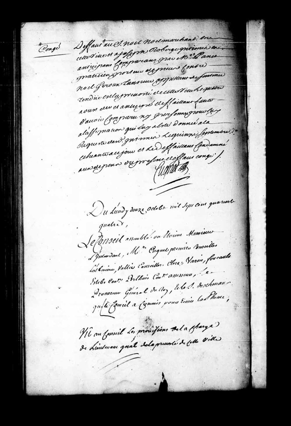 Arrêt qui reçoit maître François Daine, greffier en chef du Conseil souverain, en la charge de lieutenant général de la Prévôté de Québec. Il est ordonné que ses provisions datées à Versailles, le 25 mars 1744, seront enregistrées dans les registres du Conseil, 12 octobre 1744, Archives nationales à Québec, Fonds Conseil souverain, (03Q,TP1,S28,P19666).