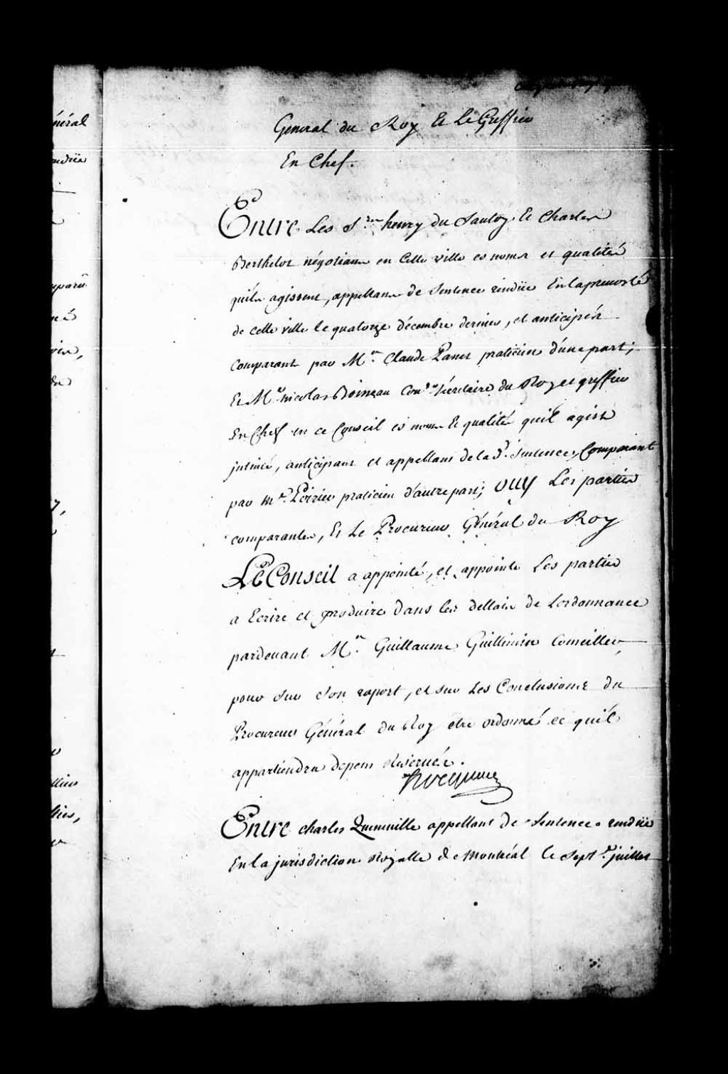 Arrêt qui ordonne, avant de faire droit, que les pièces des parties seront remises à François-Elzéar Vallier, conseiller clerc, pour en être délibéré dans la cause entre Charles Quenneville, appelant de la sentence rendue en la Juridiction de Montréal, le 7 juillet 1744, contre Pierre Ranger, marchand, demeurant à la Rivière-des-Prairies, 11 janvier 1745, Archives nationales à Québec, Fonds Conseil souverain, (03Q,TP1,S28,P19709).