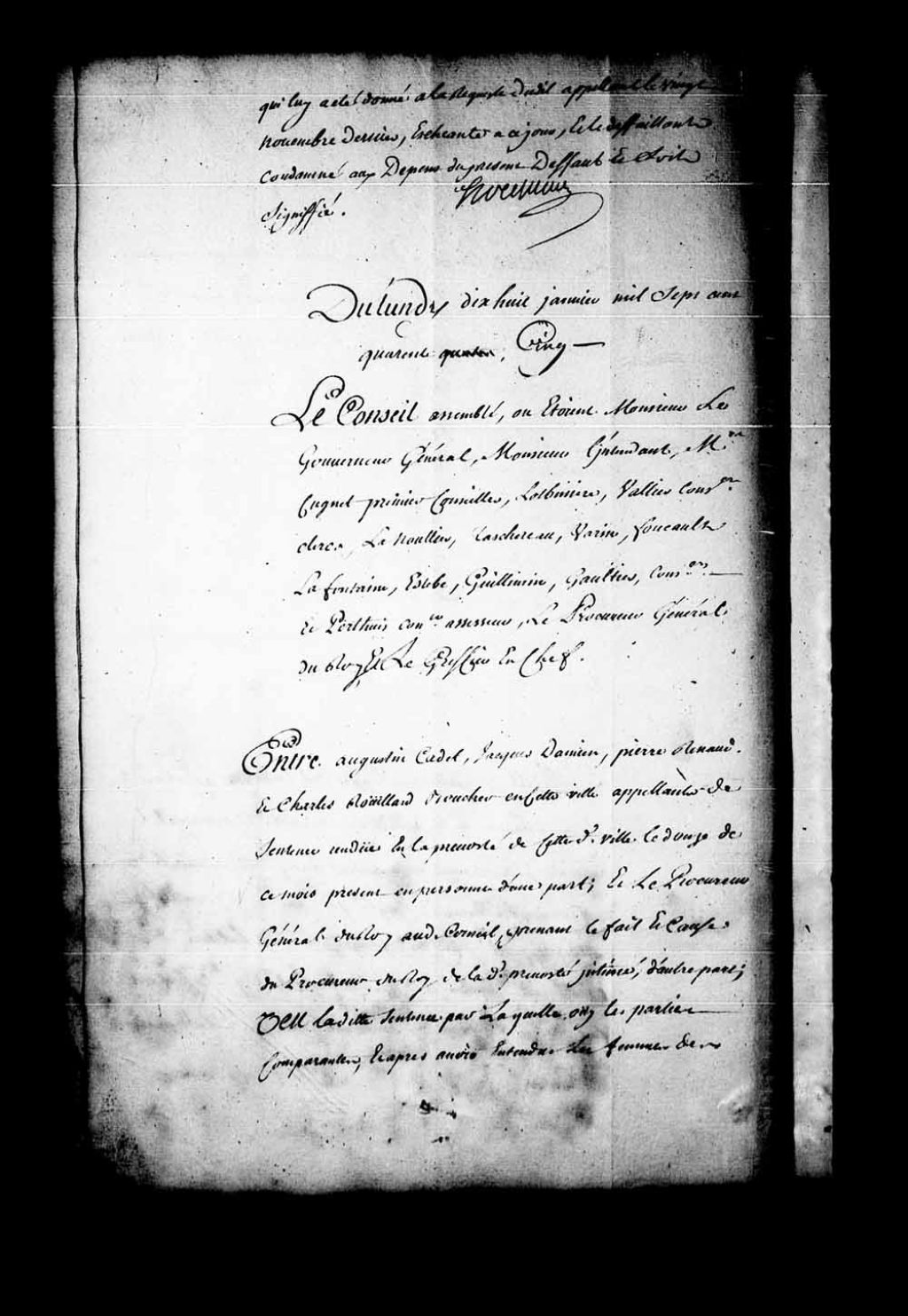 Appel mis à néant de la sentence rendue en la Prévôté de Québec, le 12 janvier 1745, dans la cause entre Augustin Cadet, Jacques Damien, Pierre Renaud et Charles Rouillard, bouchers de Québec, contre procureur général du Roi au Conseil Supérieur, prenant le fait et cause du procureur général de la Prévôté de Québec. Appel d'une sentence qui condamne les femmes des nommés Renaud et Rouillard, chacune à 150 livres d'amende, pour avoir vendu la viande de boucherie 4 sols 6 deniers la livre au lieu de 3 sols 6 deniers, ainsi qu'il était porté par l'arrêt du Conseil du 19 mars 1731. Le Conseil ordonne que ce qui est en appel sortira son plein et entier effet et cependant par grâce et sans tirer à conséquence modère l'amende prononcée à 100 livres pour chacun desdits appelants applicable aux pauvres de l'Hôtel-Dieu et de l'Hôpital général par moitié; ordonné en outre que les appelants se conformeront au règlement de ce Conseil du 19 mars 1731 jusqu'à nouveau règlement