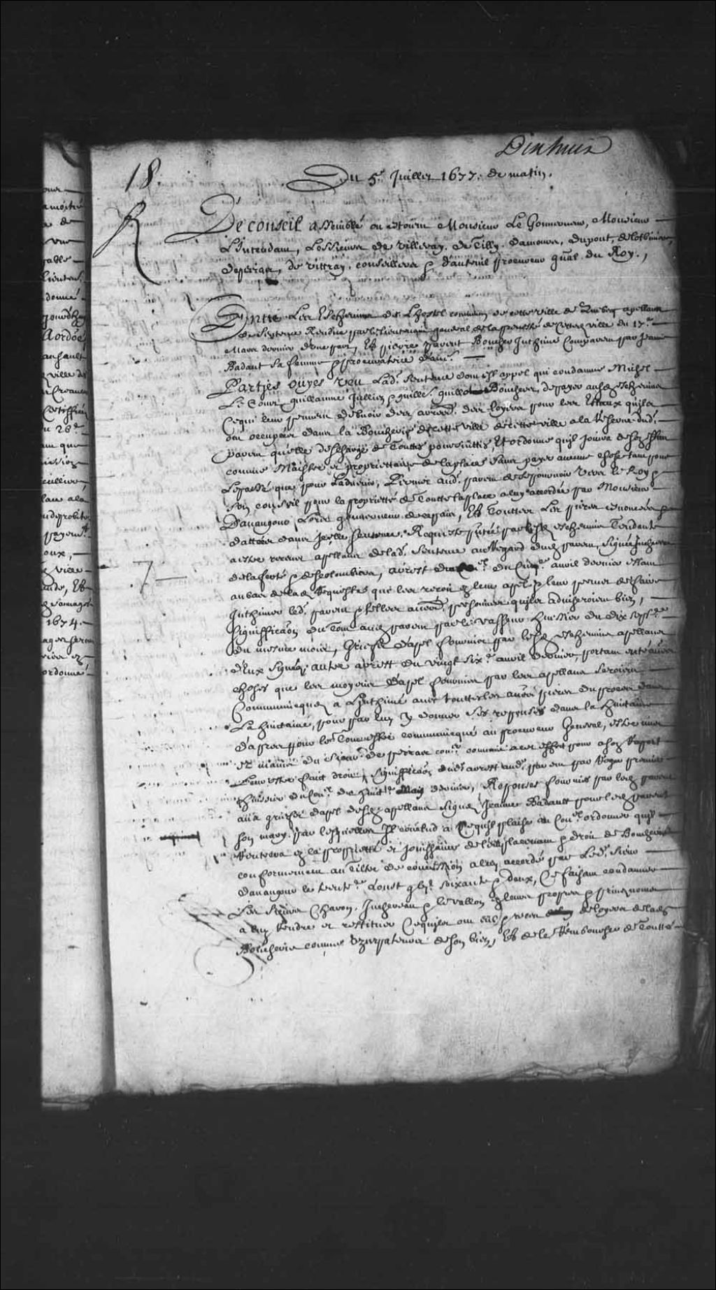 Transcription du texte avec orthographe modernisée : «Du 5e juillet 1677 de matin. Le Conseil assemblé où étaient Monsieur le gouverneur, Monsieur l'intendant, les sieurs de Villeray, de Tilly, Damours, Dupont, de Lotbinière, Depeiras, de Vitray, conseillers et d'Auteuil procureur général du Roi. Entre les échevins de l'hôtel commun de cette ville de Québec appelant de sentence rendue par le lieutenant général de la prévôté de cette dite ville du 17e mars dernier d'une part, et Pierre PARENT boucher intimé comparant par Jeanne Badaut (Badeau) sa femme et procuratrice d'autre. Parties ouïes vu ladite sentence dont est appel qui condamne Michel LeCourt Guillaume Julien et Guillaume Guillot bouchers, de payer auxdits échevins ce qui leur peuvent devoir des arrérages des loyers pour les étaux qu'ils ont occupées dans la boucherie de cette ville à la réserve dudit Parent qu'elle décharge de toutes poursuites, et ordonne qu'il jouira de son [...]