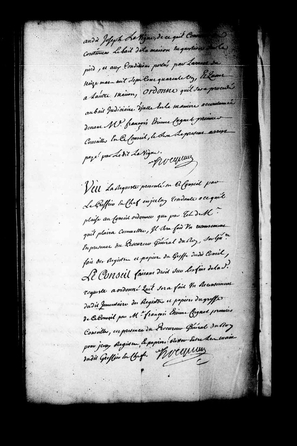 Arrêt qui, sur la requête présentée en ce Conseil par le greffier en chef tendante à ce qu'il plaise au Conseil, ordonne qu'il sera fait un recensement, en présence du procureur général du Roi, des registres et papiers du dit Conseil. Le Conseil, faisant droit sur les fins de la dite requête, ordonne qu'il sera fait un recensement de l'inventaire des registres et papiers du greffe de ce Conseil par François-Etienne Cugnet, premier conseiller, pour ceux-ci, registres et papiers, rester entre les mains du dit greffier en chef