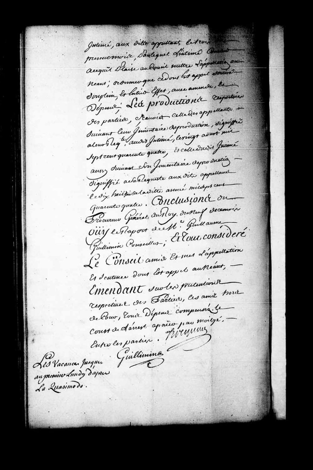 Le Conseil donne vacances jusqu'au premier lundi d'après la Quasimodo, 12 avril 1745, Archives nationales à Québec, Fonds Conseil souverain, (03Q,TP1,S28,P19772).
