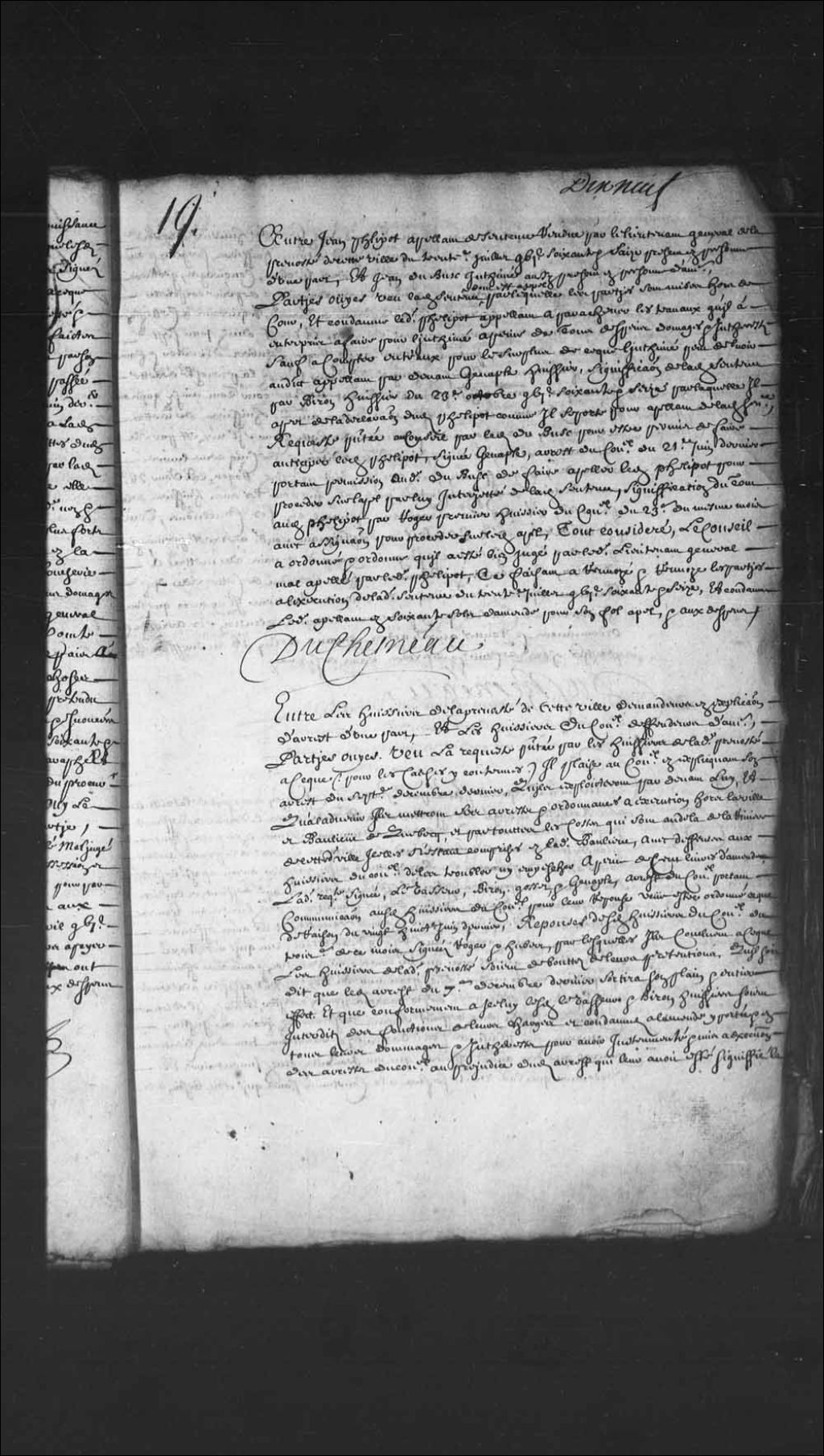 - Transcription du texte avec orthographe modernisée : «Entre les huissiers de la prévôté de cette ville demandeurs en explication d'arrêt d'une part, et les huissiers du Conseil défendeurs d'autre. Parties ouïes vu la requête présentée par les huissiers de ladite prévôté à ce que pour les causes y contenues il plaise au Conseil en expliquant son arrêt du septième décembre dernier, qu'ils exploiteront par-devant lui, et qu'à l'avenir Ils mettront ses arrêts et ordonnances a exécution hors la ville et Banlieue de Québec, et par toutes les côtes qui sont au-delà de la Rivière de cette dite ville icelles n'étant comprises en ladite Banlieue, avec défenses aux huissiers du Conseil de les troubler ni empêcher à peine de cent livres d'amende, ladite requête signée, Levasseur, Biron, gosset et Genaple, arrêt du Conseil portant communication auxdits huissiers du Conseil pour leur réponse vue être ordonné ce que de raison du vingt-huitième juin dernier. Réponses desdits huissiers du Conseil du troisième de ce mois signées Roger et Hubert, par lesquelles ils concluent à ce que les huissiers de ladite prévôté soient déboutés de leurs prétentions, qu'il soit dit que ledit arrêt du 7e décembre dernier sortira son plein et entier effet et que conformément à icelui lesdits Levasseur et Biron huissiers soient interdits des fonctions de leurs charges et condamnés a l'amende y portée et en tous leurs dommages et intérêts pour avoir instrumenté et mis à exécution des arrêts du Conseil au préjudice dudit arrêt qui leur avait été signifié le vingt-sixième avril dernier, et au regard dudit Genaple huissier, que l'ordonnance dernière titre 13: article 3: qui défend à tous huissiers, sergents et autres officiers de justice, d'être greffiers des geôles, concierges, geôliers, ni guichetiers à peine de cinq cents livres d'amende et de peine corporelle s'il y échoit, sera exécutée selon sa forme et teneur, requérant à cette fin l'adjonction du procureur général du Roi, arrêt dudit jour septième décembre dernier, portant pouvoir auxdits Roger et Hubert d'exercer et faire les fonctions de leursdites charges d'huissier tant en la prévôté de cette ville que autres justices du ressort de cette Cour tout ainsi qu'ils ont fait ci-devant, avec défenses à tous autres huissiers de mettre a exécution les ordonnances et arrêts de cette Cour s'il n'en est par elle autrement ordonné sur peine d'interdiction et de cinq cents livres d'amende, signification dudit arrêt fait par ledit Roger ledit jour 26 avril dernier audit Genaple tant pour lui que pour les autres huissiers de la prévôté, et ouï le procureur général en ses conclusions, tout considéré. Le Conseil en expliquant sondit arrêt permis et permet à tous huissiers et sergents royaux de ce pays de mettre a exécution ses arrêts et ordonnances hors l'étendue de cette ville, et Banlieue d'icelle, dans laquelle ville et Banlieue il n'y aura que les huissiers du Conseil qui y pourront mettre a exécution ses arrêts et ordonnances et toutes autres actes en les mains de lui, et au surplus les parties hors de Cour et de procès sans dépens. DUCHESNEAU.»